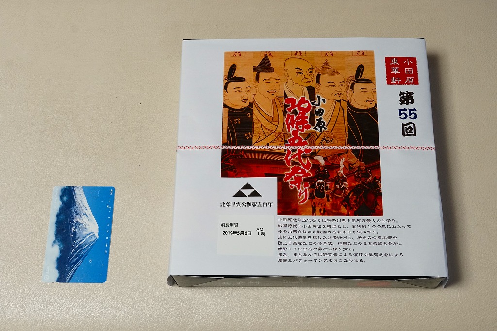 神奈川県小田原市の小田原城の周辺で、毎年5月3日に開催されるお祭り「小田原北條五代祭り」の開催に合わせて、小田原駅でやはり毎年販売される期間限定駅弁の、2019(令和元)年版。掛紙には「北条五代」と総称する、16世紀の室町時代や戦国時代に小田原を統治した北条早雲、北条氏綱、北条氏康、北条氏政、北条氏直の肖像画を並べた。