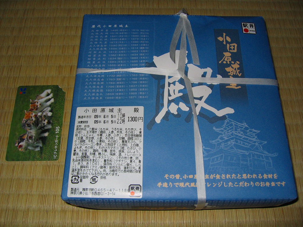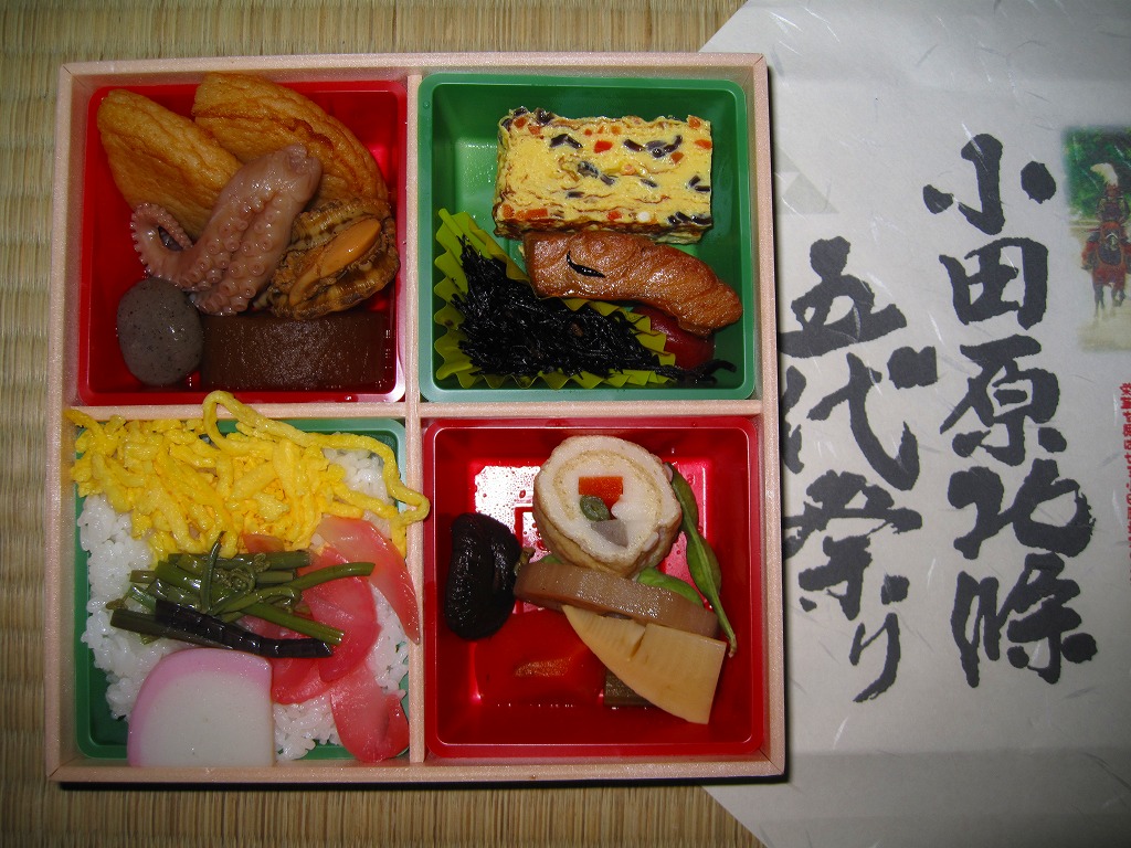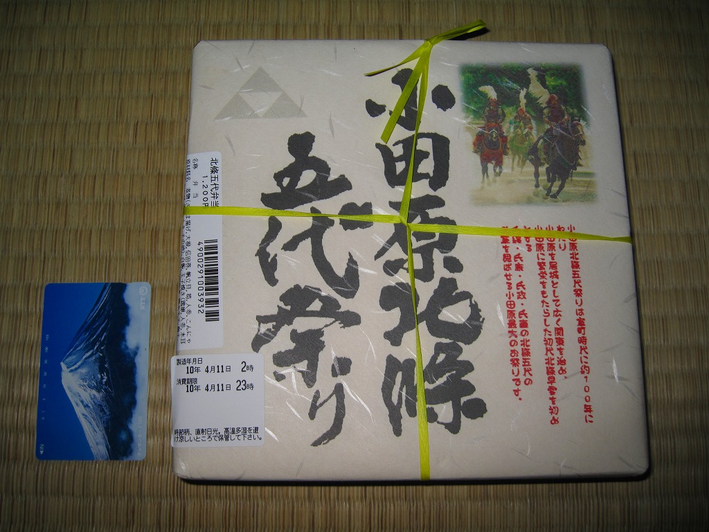 2010(平成22)年4月10日から11日まで東京駅で開催された第11回東日本縦断駅弁大会で販売された記念駅弁。八戸、一ノ関(2種)、仙台(2種)、小田原、米沢(2種)、郡山、直江津、長岡、松本、小淵沢で13種を数えた「戦国・歴史駅弁」のひとつ。小田原駅で販売されたかどうかは分からない。木目柄で正方形の華奢な容器を使用、駅弁の名前イコール小田原でのお祭りの名前とそのイメージを描いた大きな掛紙で包む。