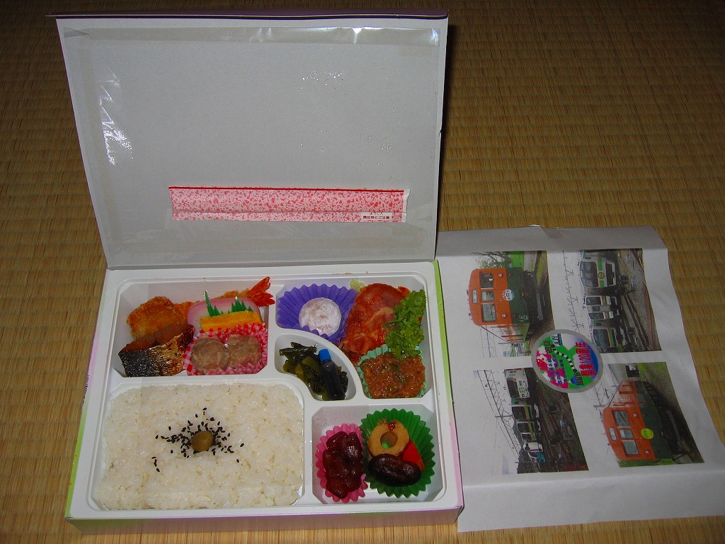 市販のボール紙弁当箱にインクジェット印刷の掛紙をかける。中身は日の丸ご飯にサワラ照焼、エビフライ、蒲鉾、玉子焼、豚味噌焼、煮物、金時、野沢菜、お菓子に、小田原駅弁のとりそぼろとシュウマイ。中身を書けば豊富に聞こえて、その見栄えや風味や分量は480円の惣菜レベル。外観も含めてNREや秩父鉄道の同種駅弁と比べるのがかわいそうな出来で、わざわざメガターミナルで復刻販売しないほうがよかったかもしれない。