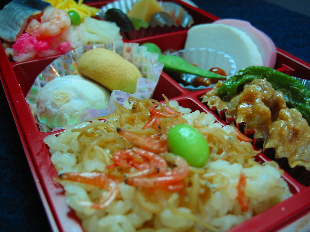小田原駅の駅弁屋の弁当なのに、直営の駅弁売店では取り扱われない、街弁の扱いであるらしい商品。正方形ボール紙製の市販惣菜弁当容器に駅弁の名前を記し、食品表示ラベルを貼った紙帯を巻き輪ゴムで留める。中身はトレーで9分割され、じゃこめし・炊込飯・赤飯と三種の御飯と、チーズ帆立やナス豚肉揚げ、春巻や枝豆揚や春巻に椎茸や人参などの煮物、デザートに弁当名の焼き印がある温泉饅頭。