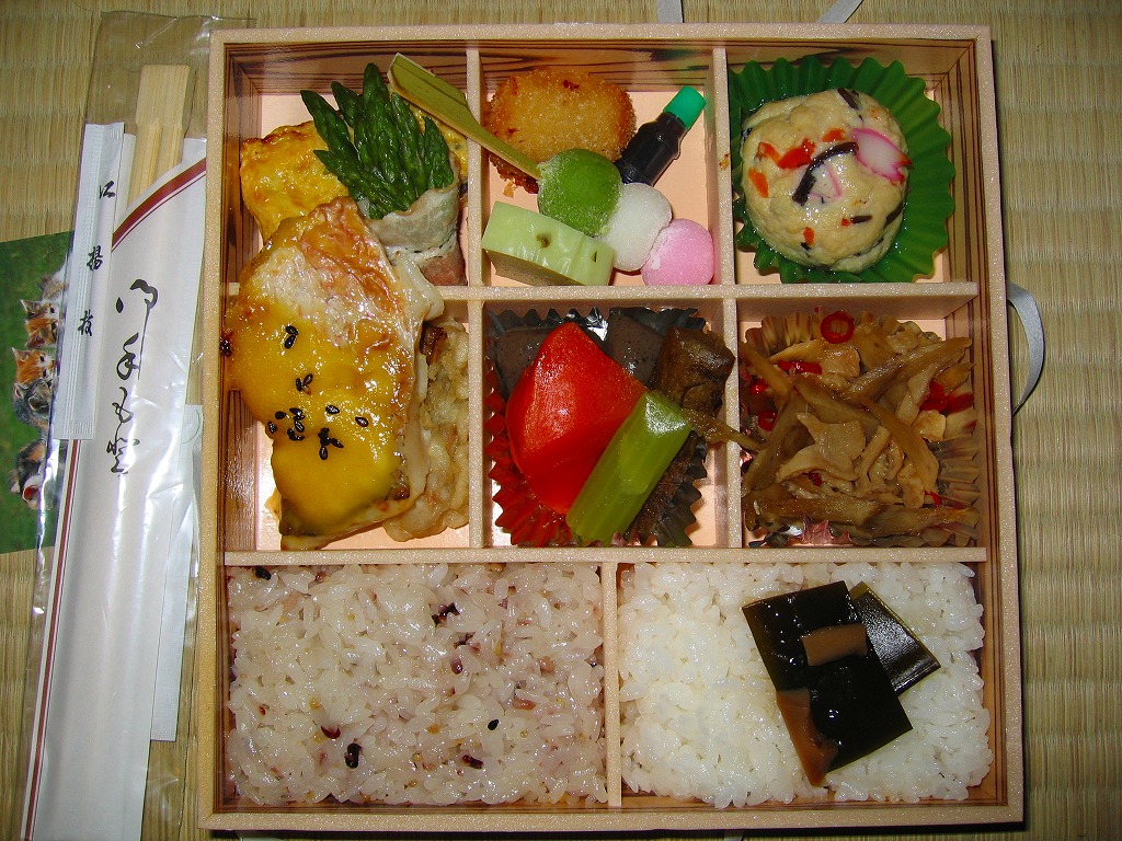 中身は赤と緑のプラ製トレー4個に収まり、錦糸卵やかまぼこや山菜などを載せた御飯、さつま揚げにダイコンやタコやホタテなどの煮物、玉子焼にキンメダイ煮にひじき、タケノコやレンコンなどの煮物。1,200円も取る駅弁なのに、容器にも起因する詰め方の見栄えの悪さがとても気になり、本来は悪くないはずの味を落とした印象。