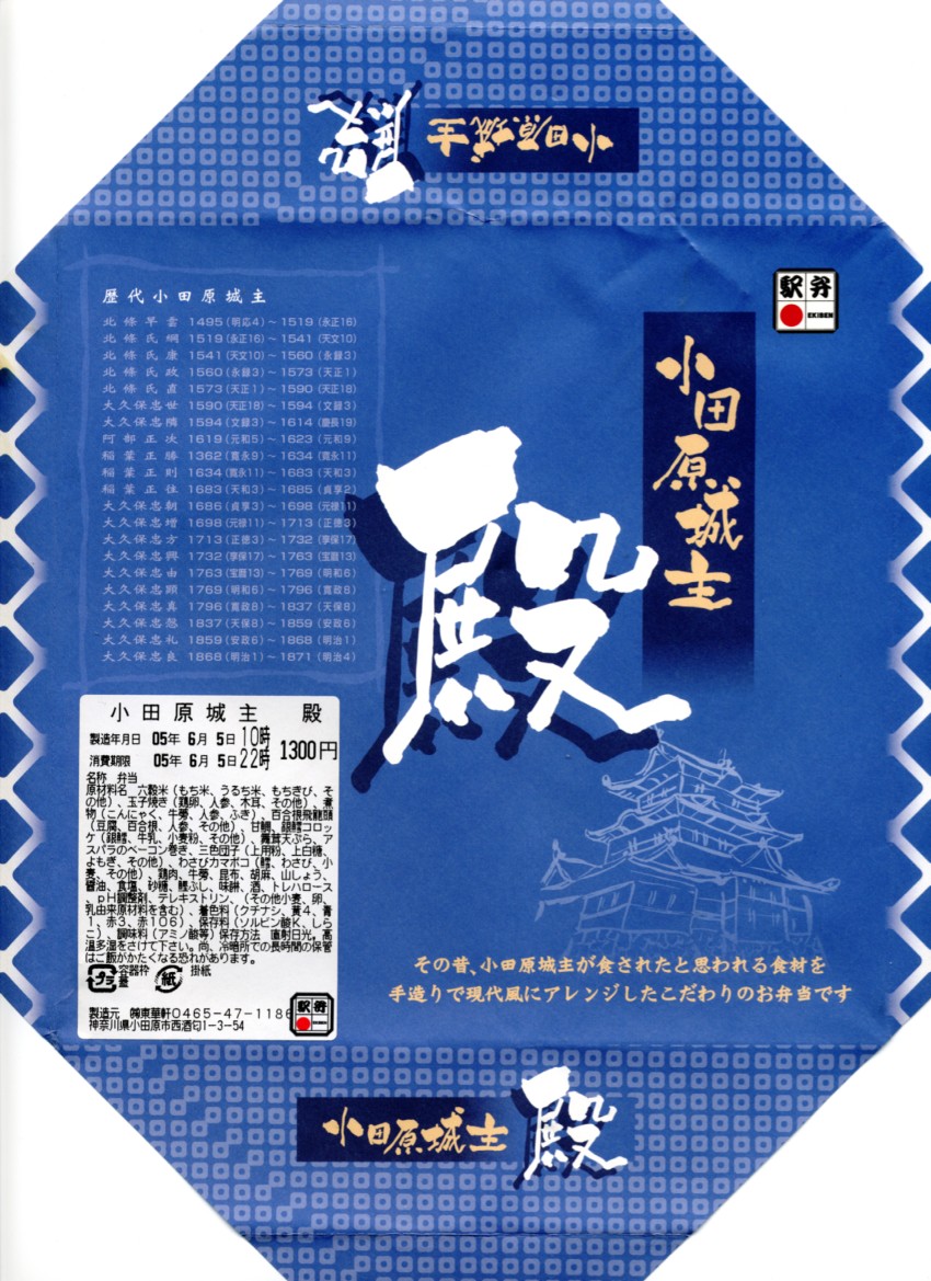 2005(平成17)年3月に「小田原城主 姫」と同時に発売か。正方形の容器に木目調の紙のふたをかけて、青い大きな掛紙で包み白い紙ひもでしばる。中身は六穀米の御飯と昆布載せ白おこわ、甘鯛黄身焼に百合根飛龍頭に銀だらコロッケなど。小田原城主が食べたと思われる食材を現代風にアレンジしたと掛紙に書かれる、高価格高品質の駅弁。「姫」とともに一日30個限定の模様。2006年に終売か。
