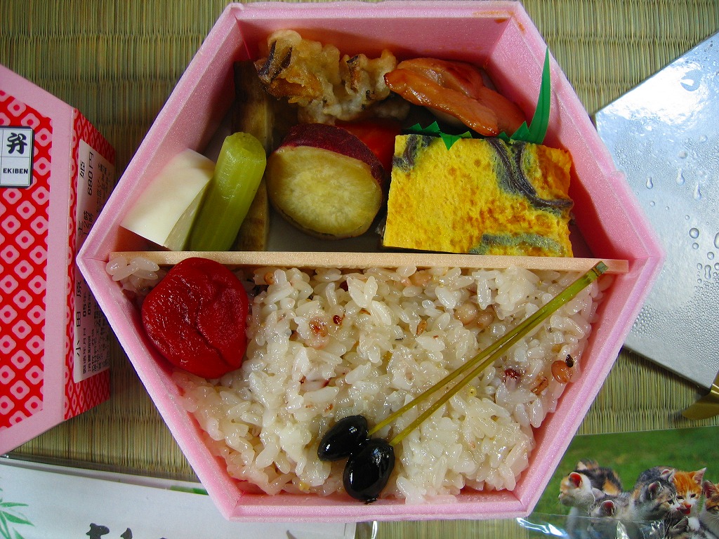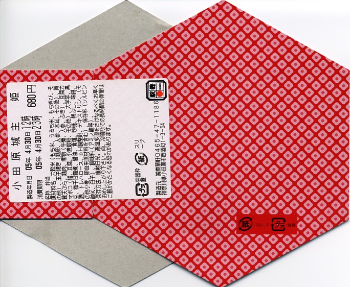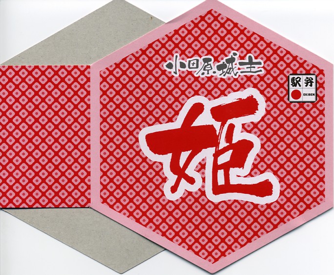 2005(平成17)年3月に「小田原城主 殿」と同時に発売か。小さな小さなピンク色の正六角形の容器を、同じ形で同じ色のボール紙にはめる。中身は黒米・赤米・鳩麦・黒胡麻・餅きび・大麦の六穀米に、薩摩芋や玉子焼や鶏きじ焼や舞茸天や豆腐蒲鉾など。分量はとても少ないが、中身は多種多様で価格も控えめなので、小田原城を観光名所と見なす高齢者の方々にぴったりの駅弁。「殿」とともに一日30個限定の駅弁らしいが、売店でその両方を一度に見る機会は少ない感じ。2006年に終売か。