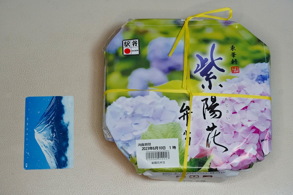 この名前の小田原駅弁は、2012年、2017年、2018年、2021年の6月やその前後に売られたようだ。今回の2023(令和5)年は、5月中旬から7月10日まで売られた、夏の駅弁。掛紙の絵柄は駅弁の名前のとおり、紫陽花(あじさい)でできている。正八角形の容器を4分割した今回の中身は、梅入りゆかり御飯、ゆかり風味鶏天と野菜すり身揚げと竹輪磯辺揚げ、玉子焼と焼き魚とヤングコーンととりそぼろ、大根や蓮根などの煮物といちごくず餅。調製元は小田原駅弁の東華軒で、小田原駅でも買えると思うが、主に東京駅や新宿駅など東京の駅弁売店で売られるものだと思う。2024年は5月7日から7月10日まで販売した模様。