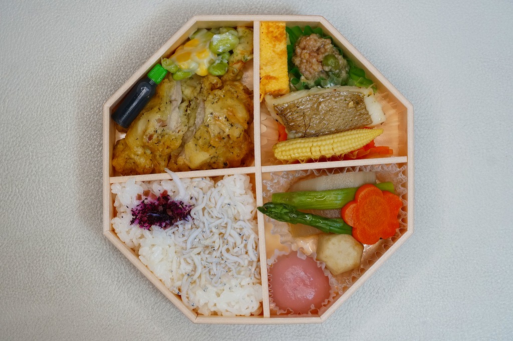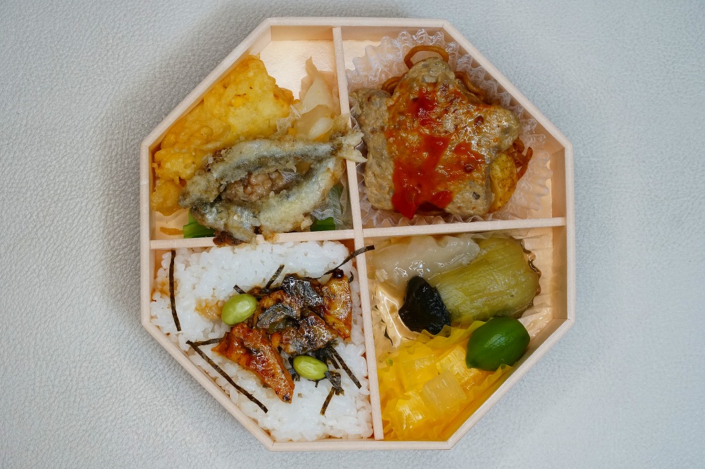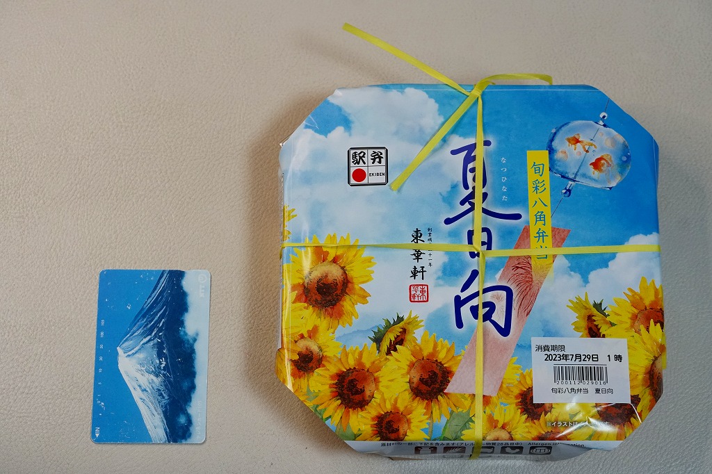 この名前の小田原駅弁は、2023(令和5)年7月11日に初めて発売か。8月まで販売する、夏の駅弁。掛紙の絵柄は青い空とヒマワリと風鈴で、夏真っ盛り。正八角形の容器を4分割した中身は、うなぎごはん、とうもろこしの天ぷらと姫鮎の竜田揚げとゆず大根と冬瓜のそぼろあんかけ、トマトソースがけ星型ハンバーグと焼きそばと皮つきフライドポテト、焼き小茄子の煮物と若桃の甘露煮の寒天添え。調製元は「夏の賑やかで華やかな雰囲気をテーマとして、旬の食材や夏を感じさせる食材を盛り込んだお弁当」としたが、そう思えたかどうか。おかずがしっかしりたお弁当。2024年は7月11日から8月31日まで販売。