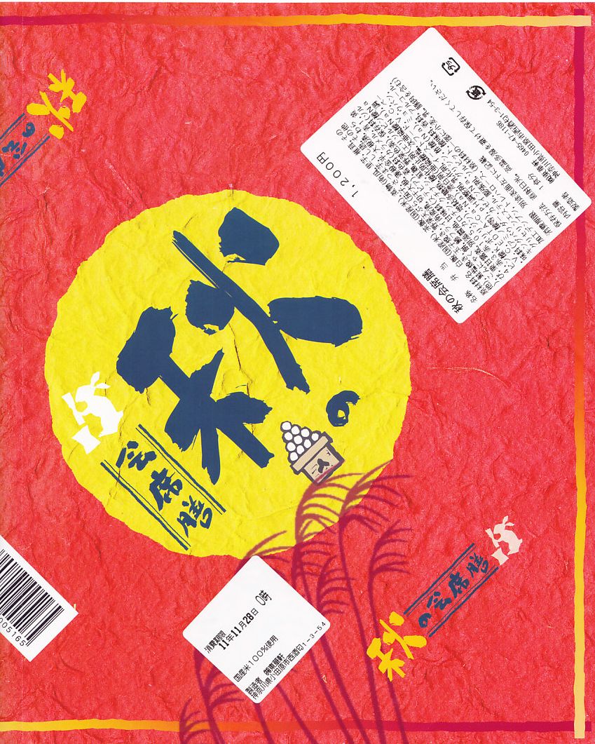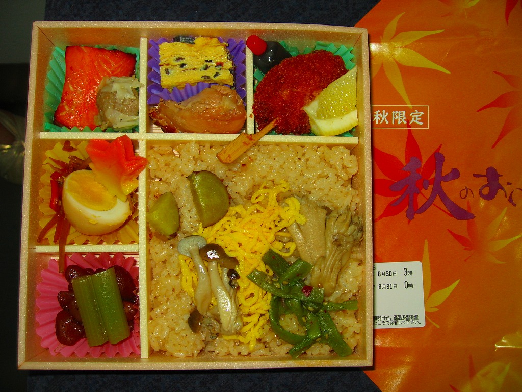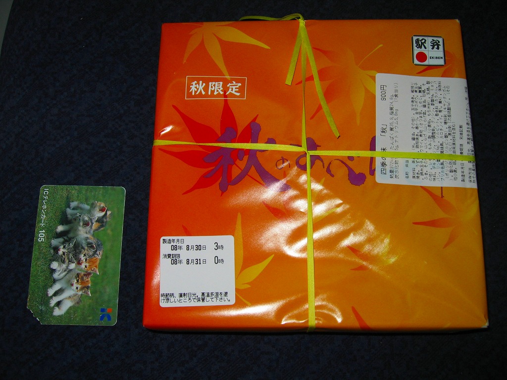 小田原駅の秋駅弁の、2008(平成20)年時点での姿。掛紙と容器は変わらないが価格は50円アップ、中身も見た目は似ているが一新され、シメジやマイタケの御飯に串カツ、鶏照焼、玉子焼、煮玉子、鮭照焼、焼売、きんぴら、うずら豆など。秋らしさも出ている、相変わらずおかずがおいしい、御飯がもっとおいしい季節駅弁。8月はまだ夏だと思うけれど。