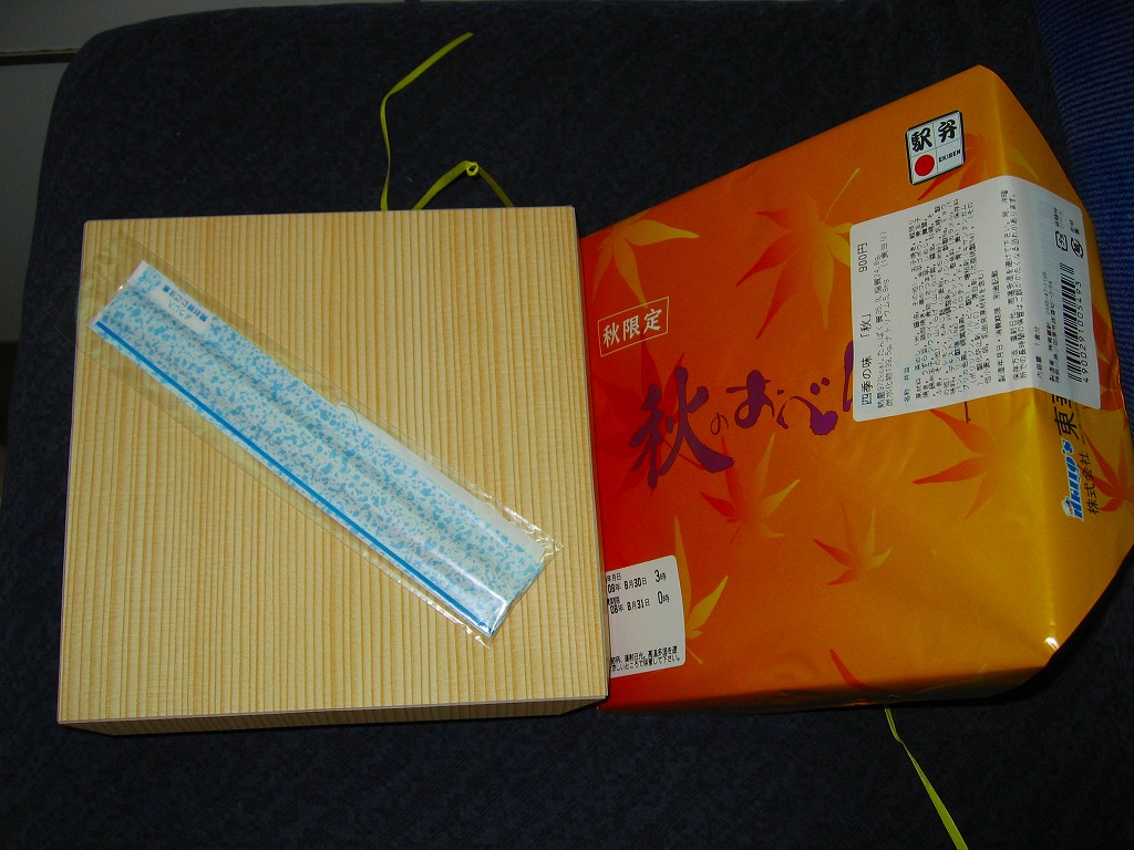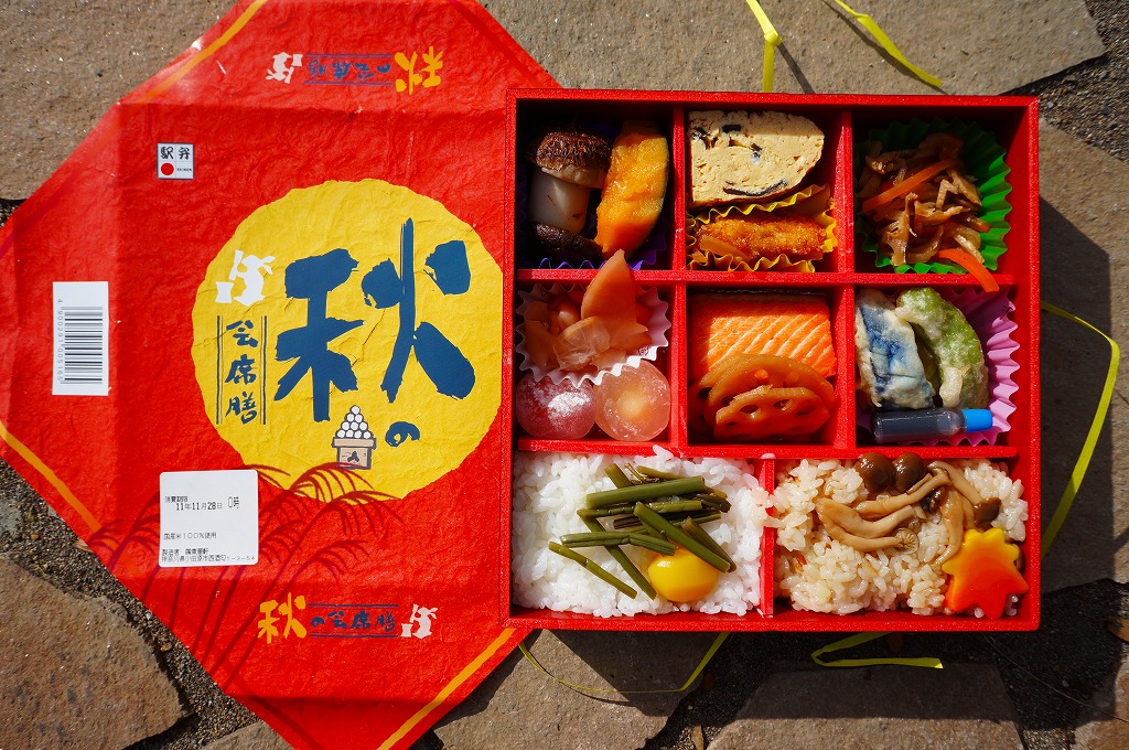小田原駅の秋駅弁の、2011(平成23)年時点での姿。3年前のものと比べて価格と名前も含めて似て非なる感じ。今回の中身は山菜載せ御飯とシメジ載せ茶飯、サケ塩焼、ナスやシシトウなどの揚げ物、玉子焼、カボチャやサトイモなどの煮物、アジフライ、きんぴらごぼう、こんにゃくもちなど。様々な顔を持つ小田原駅弁のうち、良い表情のほうが出ていた。現在は、この名前と価格と姿では売られていない模様。