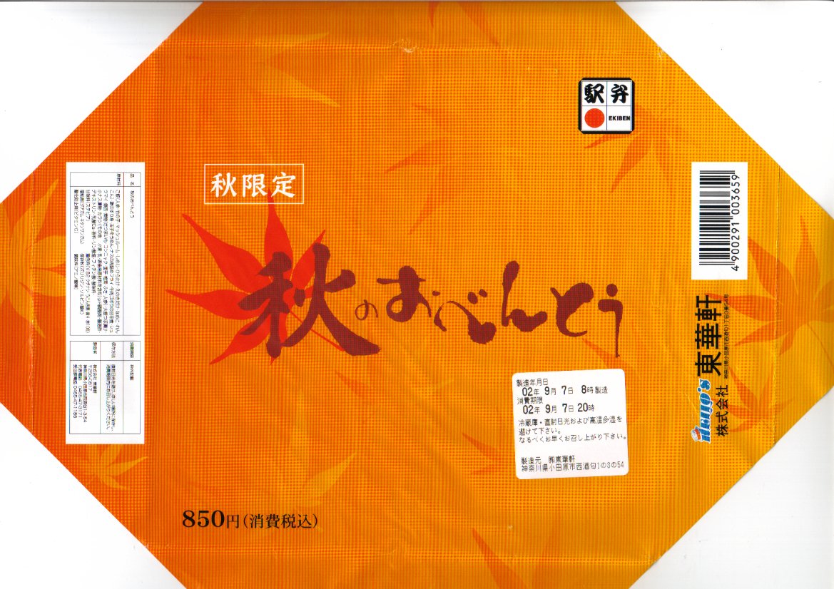 小田原駅の秋限定の駅弁。「季節のおべんとう春」とまったく同じ、正方形の容器に枯葉色の掛紙をかけて、ピンク色の紙ひもでしばる。中身はきのこの混ぜ御飯に、茄子肉詰フライ・牛肉ゴボウの甘辛煮・里芋などの煮物・銀杏などと、玉子そうめんで秋色の衣を付けた里芋煮。おかずの分量が御飯と比較して少なく見えて、飯だけで食が進み逆におかずを余してしまった。