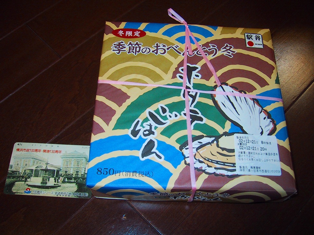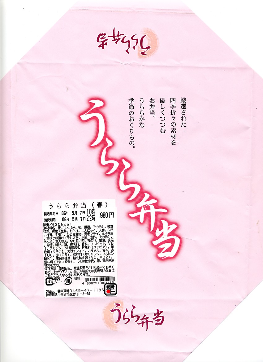 小田原駅の春駅弁の、2006(平成18)年版。前年と比べて容器や掛紙は同じで、中身も間違い探しの範囲でしか異ならないが、なぜか値段は70円下がり、3桁に抑えられた。駅弁マークが掛紙ではなく食品表示ラベルに載るのは引き続きユニーク。小田原駅の橋上化後長らく、改札内コンコースでの駅弁販売は屋台だったが、今回訪問したら改札脇に立派な売店ができており、びっくりした。