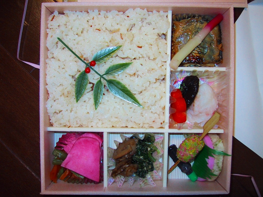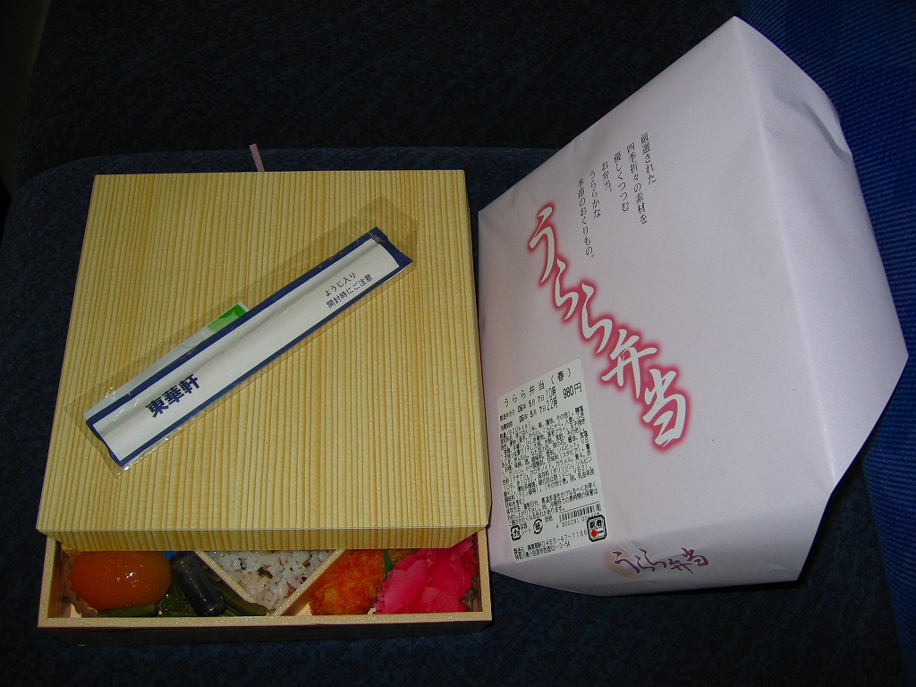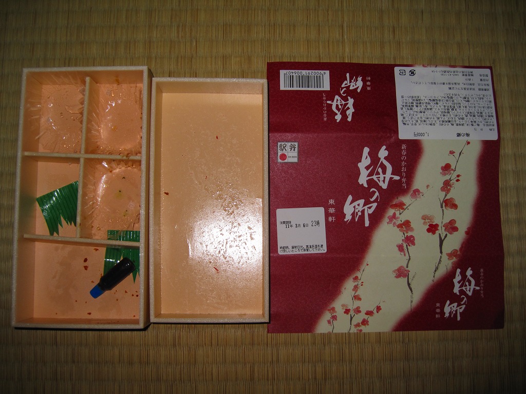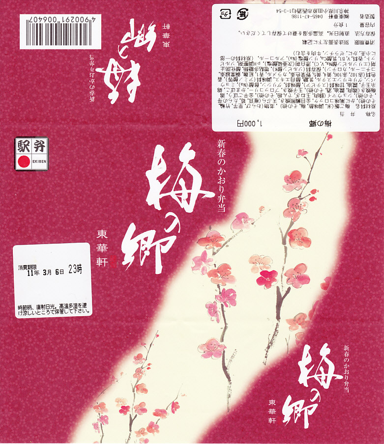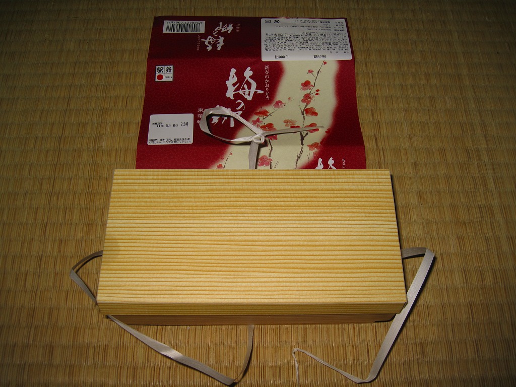 2011(平成23)年2月に発売か。長方形の容器を2段重ねて、木目柄のボール紙でふたをして、梅花を描いた梅色の掛紙で包む。中身は下段が梅御飯、上段がおかずでキンメダイ照焼、かに風味コロッケ、タラノメやタケノコなどのかき揚げ、鶏の梅焼き、サトイモやニンジンなどの煮物、かまぼこと玉子焼、シュウマイ2個など。少々のチープ感があり、下段は梅干し嫌いでも問題なく食べられるほど梅の風味が薄いものであるが、花見の弁当にできそうな分量と彩りと風味があった。2014年にも売られたようだが、おそらく現存しない。