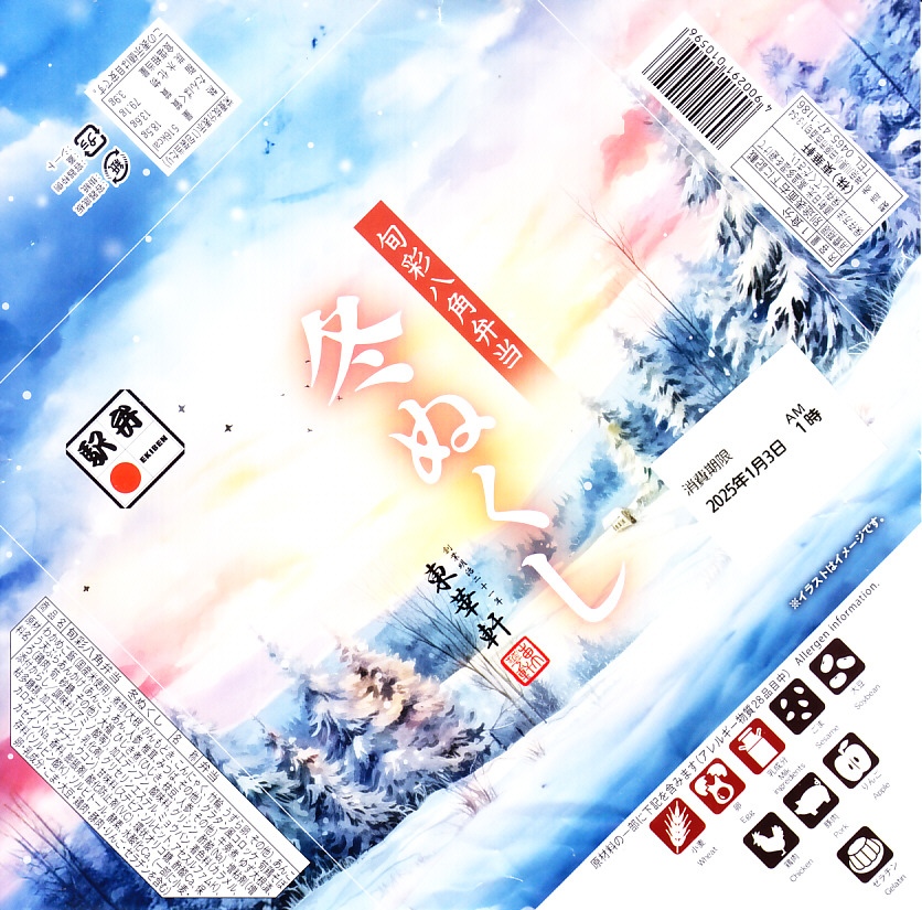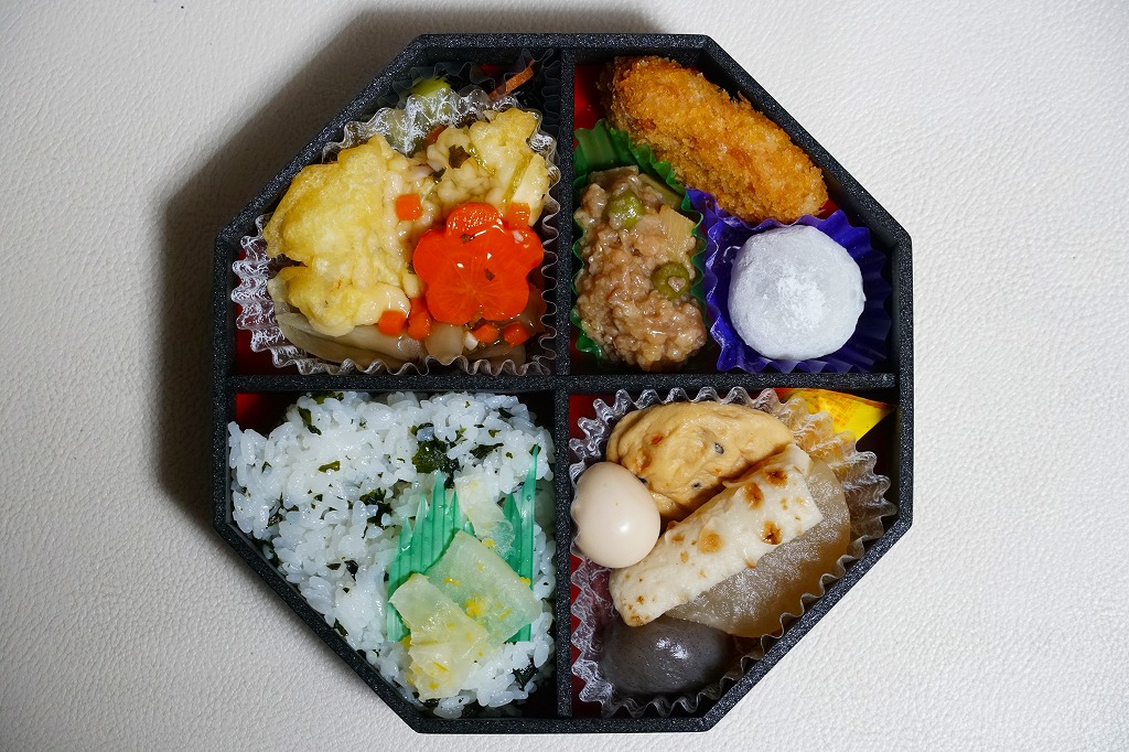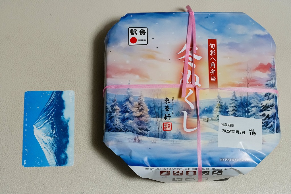2023(令和5)年12月に小田原駅などで発売。12月から1月まで販売される冬季の駅弁。駅弁の名前どおりの黒い正八角形の容器を、小田原では見られない豪雪な冬景色の掛紙で包む。4区画の中身は、わかめご飯とゆず大根漬、おでんをイメージした煮物、あんこうの天ぷらあんかけとひじき煮とごぼう煮、とりそぼろとグラタン風コロッケとミニ大福。冬らしく感じると思う食材がみずみずしい。
