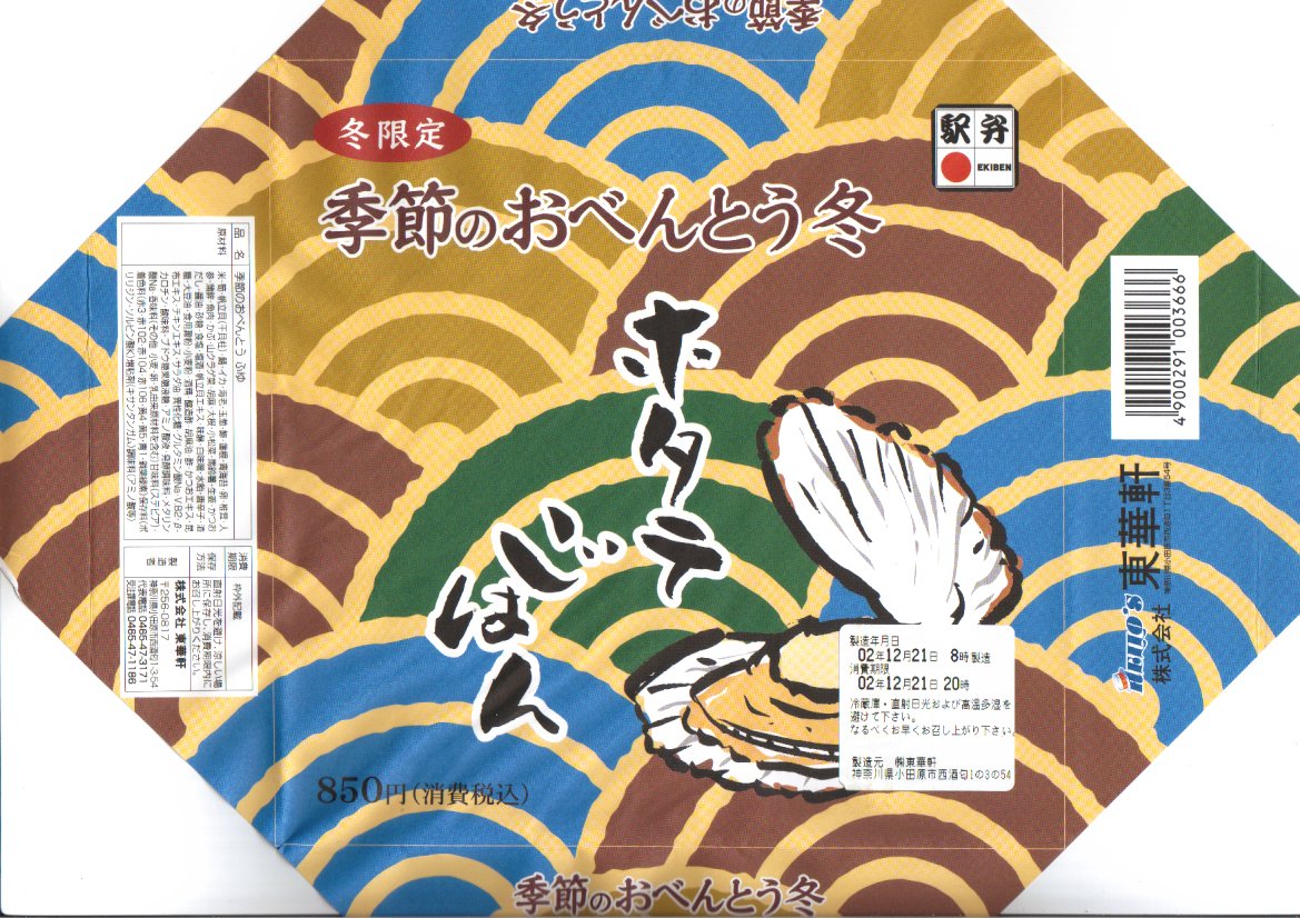 小田原駅の冬限定の駅弁。春や秋の駅弁は多いものの、冬とはっきりうたう駅弁とは珍しい。干し貝柱にじゃこなどを混ぜた炊き込み御飯があり、その周囲におかずや付け合わせを入れる5箇所の区画を配置、ここに冬鯖西京焼、魚肉すり身団子、蓮根磯辺揚や煮帆立などを入れる。「春」や「秋」同様、御飯だけで食が進む。