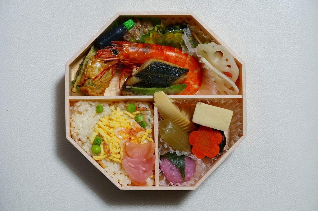 2000年代までには発売されていたらしい、春限定の駅弁。正八角形の容器を包む掛紙はサクラ色が満開で、小田原城も描かれる。中身はタケノコ御飯、タケノコや高野豆腐などの煮物と桜餅、有頭海老、サワラの山椒焼き、いんげん揚げ、ちくわ磯辺揚げ、みぶ菜漬、とりそぼろなど。エビで見栄えを華やかにした、タケノコのお弁当。小田原駅弁名物のとりそぼろにも、普段からタケノコが混じる。価格は2011年時点で1,100円、2023年時点で1,200円、2024年時点で1,300円。