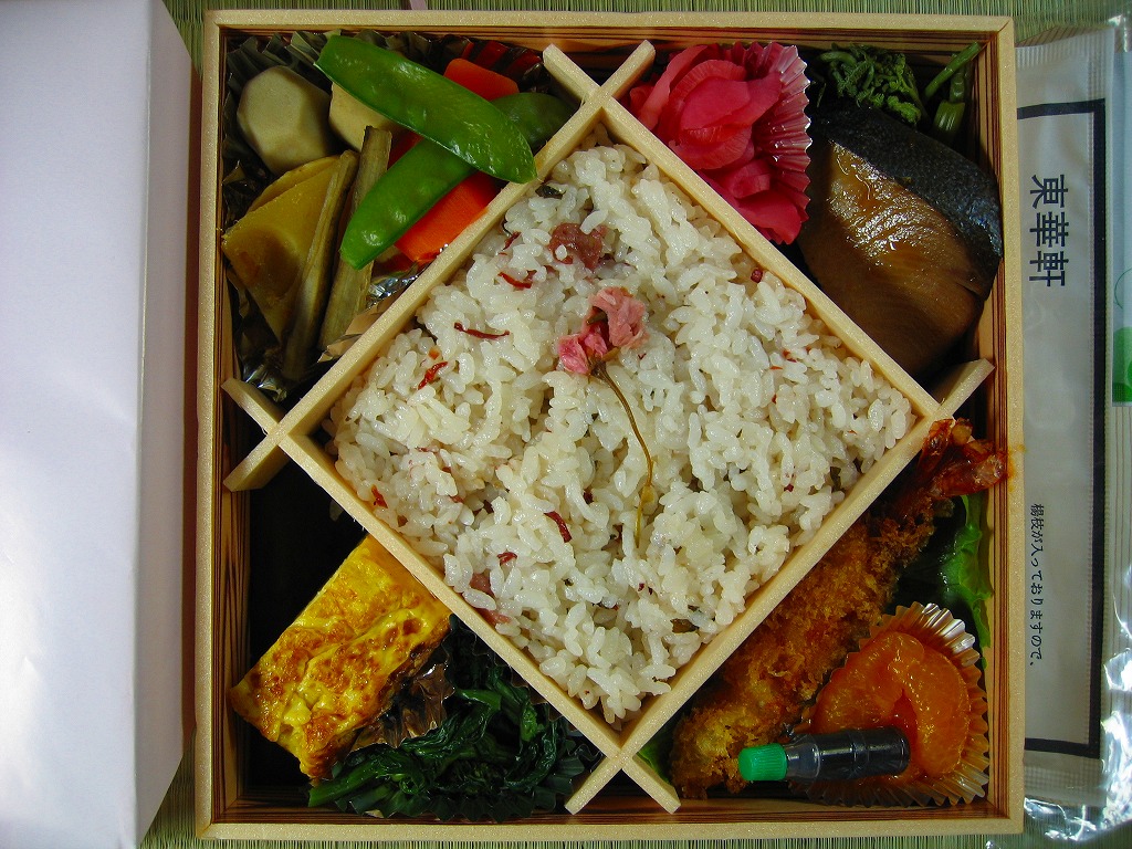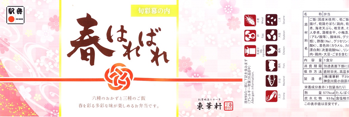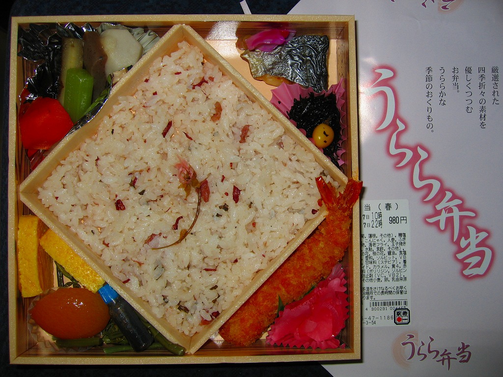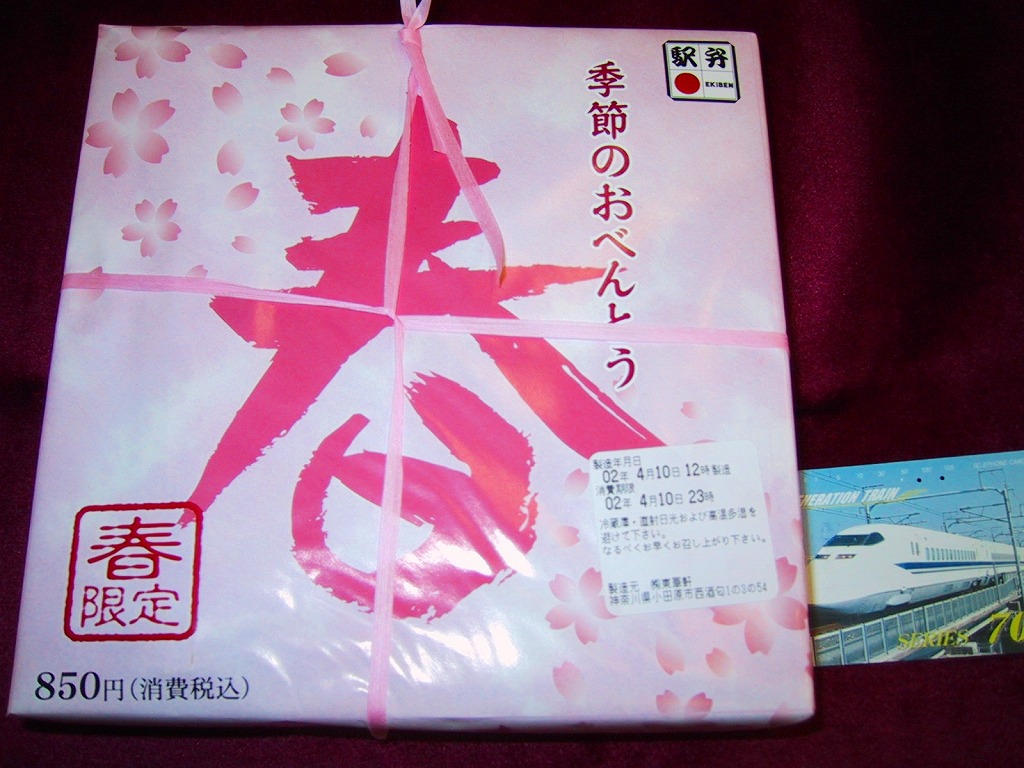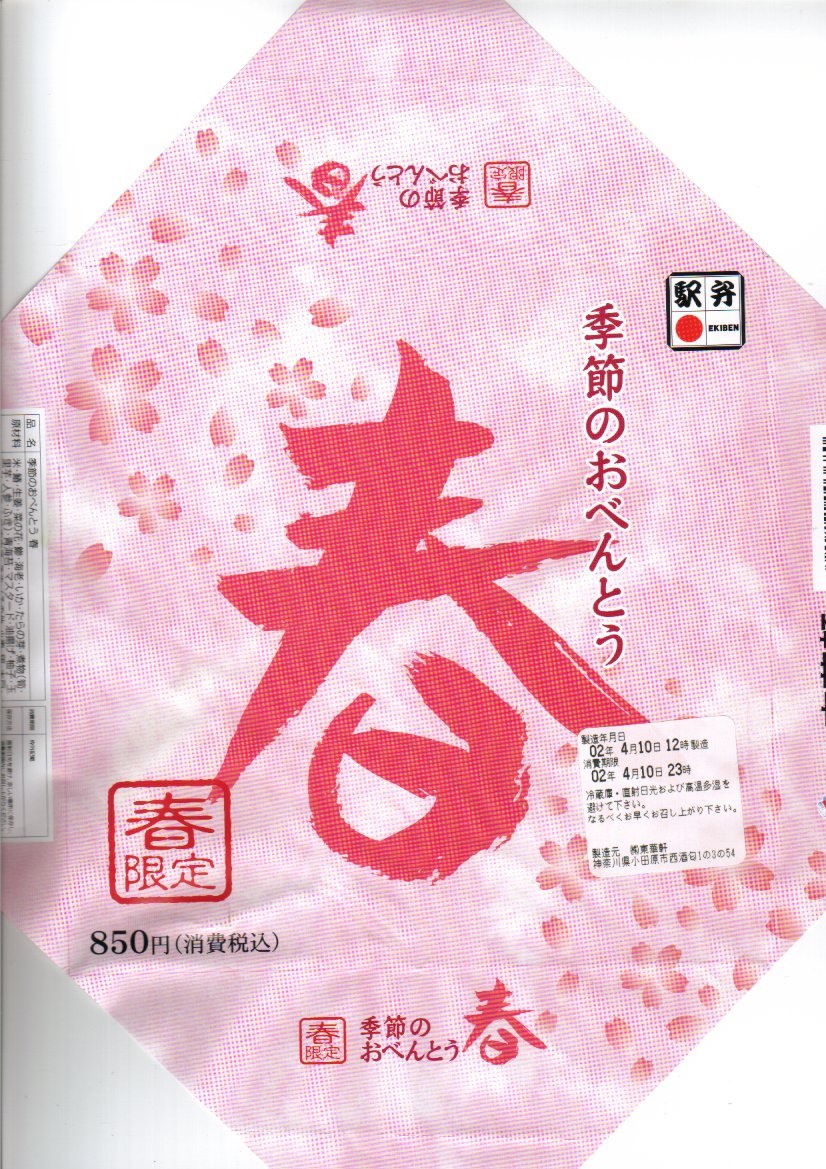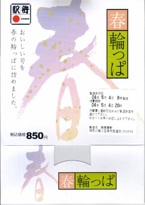 小田原駅の春駅弁の、2005(平成17)年版。木目調正方形の容器に木目印刷の紙のふたをして、これを春色の掛紙で包んで桜色の紙ひもでしばる。中身は井形の仕切りの中央に桜御飯を詰め、その周囲にブリと菜の花、里芋などの煮物、玉子焼やエビフライなどを配置する。従来の季節駅弁より200円高いが、おかずの見栄えと分量と品質がそれ以上は向上し、しかし大きな食品表示ラベルで見栄えを落としている。
