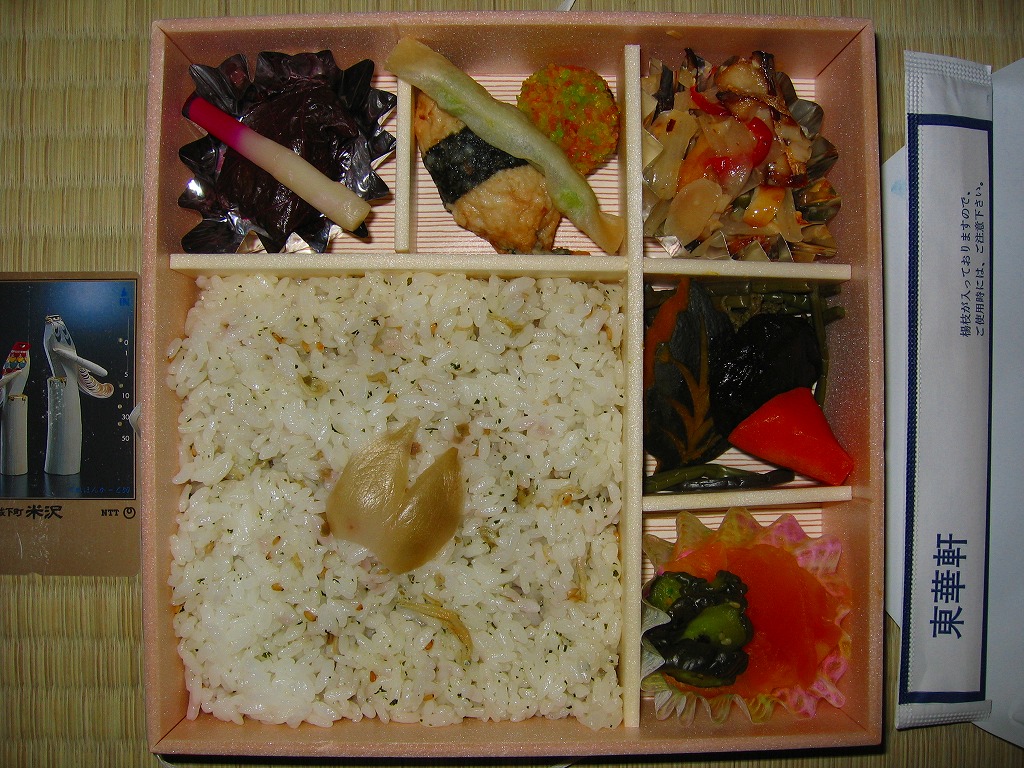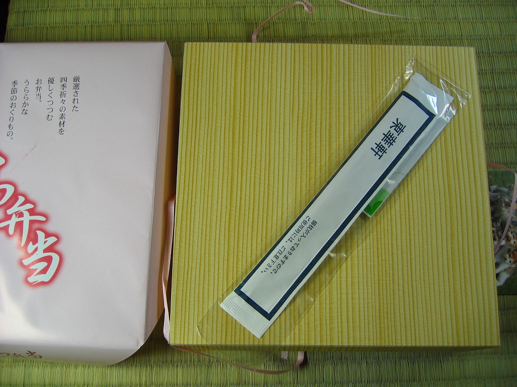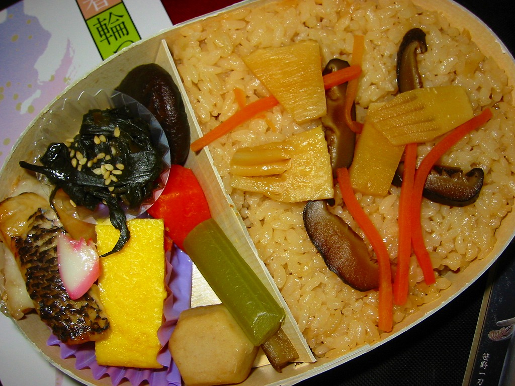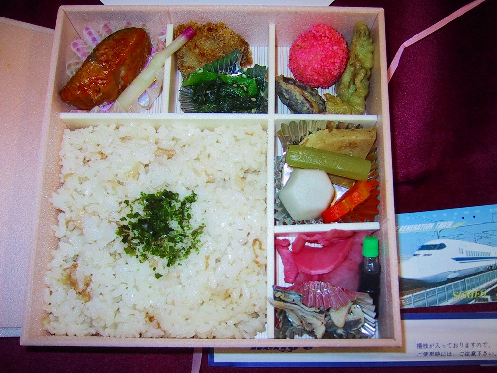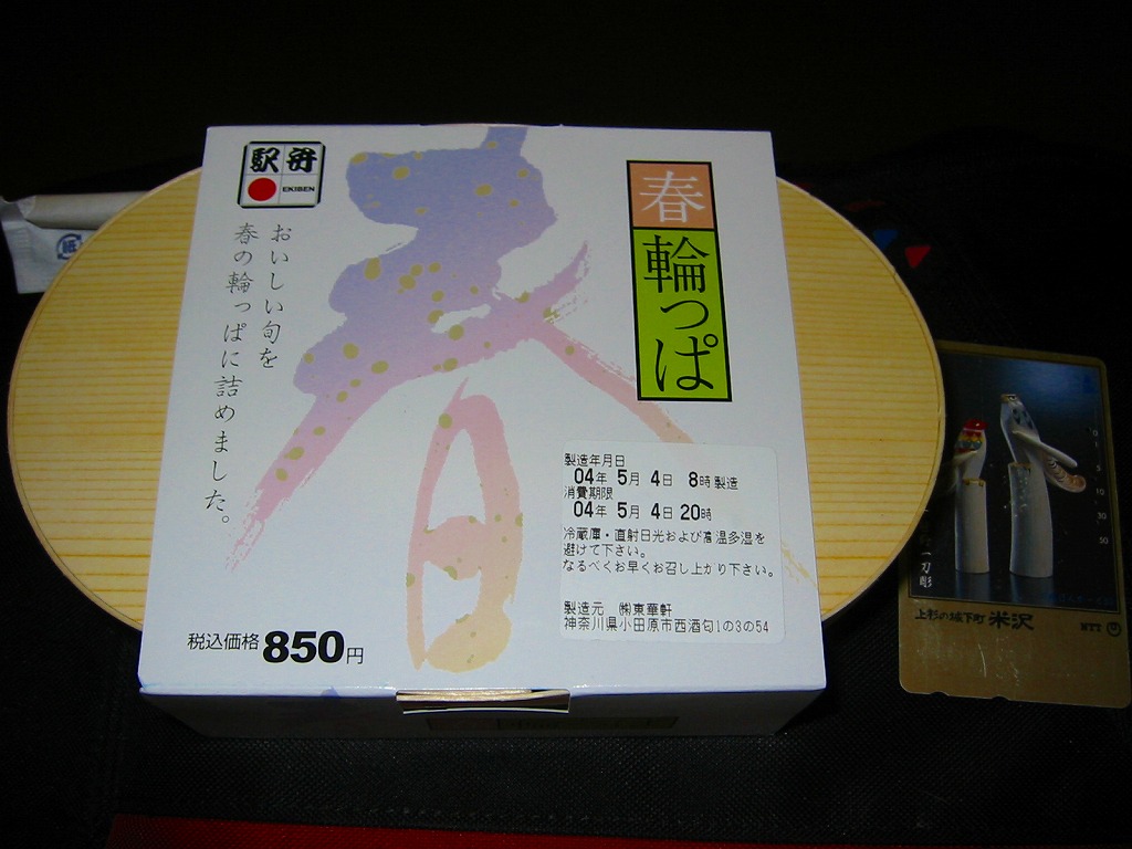 2004(平成16)年の春に発売された、新たな季節駅弁シリーズ。ふたの枠だけ経木でその他の部分はボール紙製の小判型容器をボール紙の枠で留める。中身は竹の子や椎茸などを散らした茶飯に、煮魚や煮物や玉子焼。以前からある季節の駅弁と比べて、同じ価格で同じ品質でも少量なのは寂しいが、一方でこれは少食な方にも季節駅弁を提供しようという駅弁屋さんの姿勢かもしれない。このシリーズはこの年限りか。
