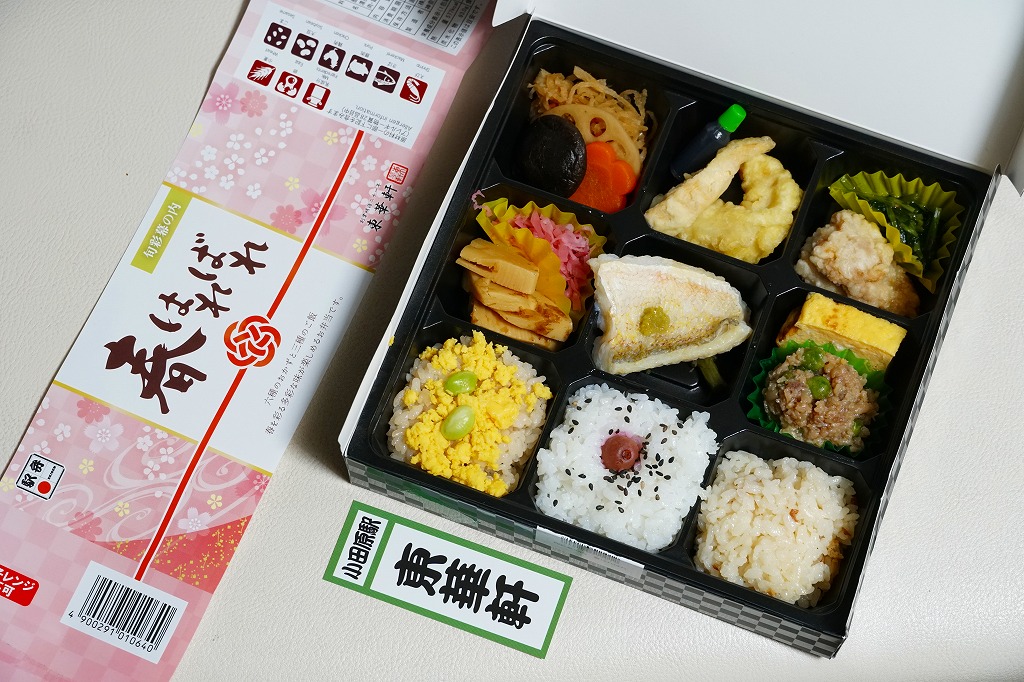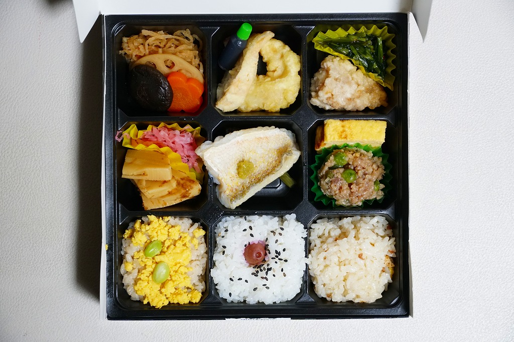 仕出し弁当向けの黒い紙箱に、春の色と文字と絵柄を持つ掛紙を巻く。「六種のおかずと三種のご飯」を名乗る、プラ製トレーによる9区画の中身は、日の丸御飯、たけのこ御飯、玉子そぼろ御飯、小田原駅弁のとりそぼろと玉子焼、甘鯛の塩焼き、タケノコの土佐煮と大根の漬物、切り干し大根とシイタケやレンコンやニンジンの煮物、たけのこと海老の天ぷら、鶏唐揚にみぶ菜とわさびの醤油漬。タケノコは小田原駅弁では通年のものなので、中身はオールシーズンで使えそう。