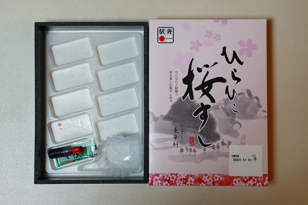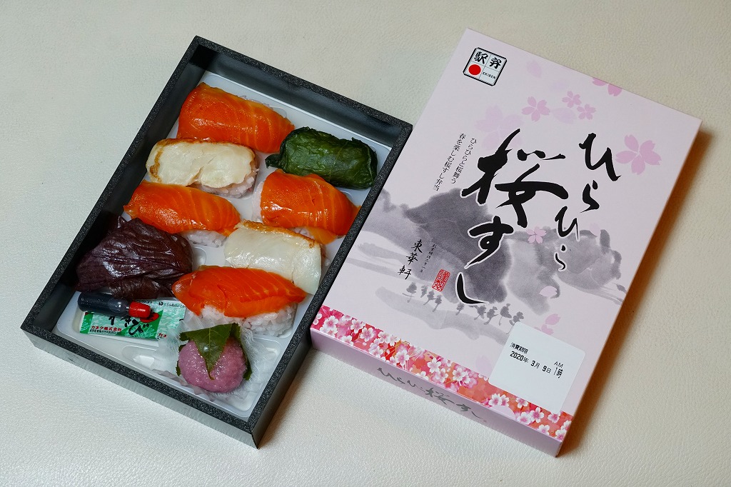 2013(平成25)年頃の発売か。春季限定の駅弁と思われる。小田原駅で伝統の駅弁「小鯵押寿司」と同じ構造の容器に、小鯵押寿司と同じような大きさで、サーモン4個、炙り金目鯛2個、高菜巻1個、しそ巻1個の押寿司と、桜餅1個を並べる。不思議と紹介例や収穫報告がほとんどない、幻のような駅弁。酸っぱい要素がないので食べやすい。2021年までの販売か。