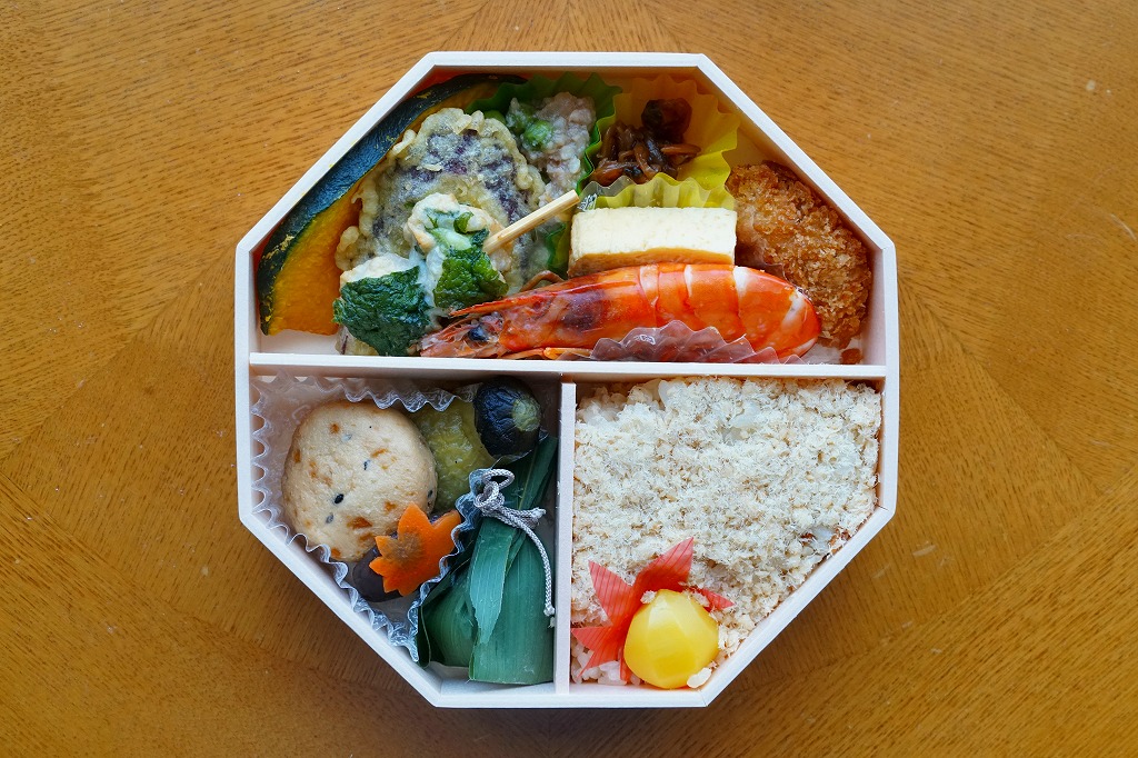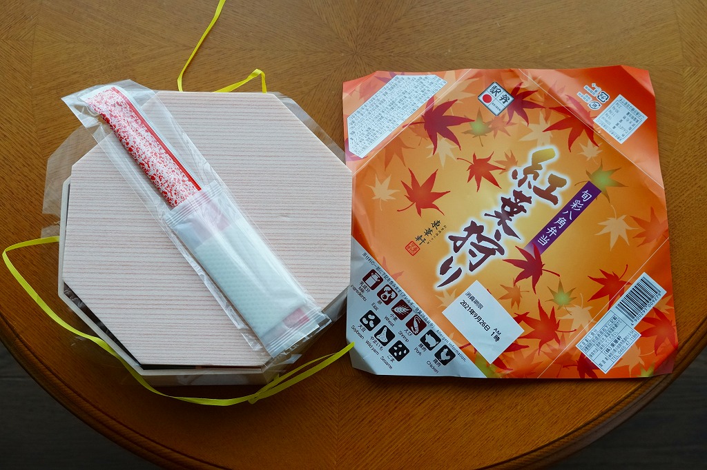2019(令和元)年の秋に発売か。東京の新宿駅で購入したが、見栄えと名前と調製元から、これはきっと小田原駅の秋駅弁だろう。正八角形の容器を包む正方形の掛紙は、名前どおりの紅葉色。中身は鯛飯に栗を添え、ナスやがんもどきなどの煮物に笹団子を添え、有頭海老、ナスの肉詰めフライ、かぼちゃ、サツマイモの天ぷら、しそ団子串、アサリ佃煮など。高級になった秋のお弁当。2020年までは鯛飯でなくきのこ御飯を詰めたらしい。価格は2019年の発売時で1,100円、2020年秋は1,180円、2021年は販売なしか、2022年秋は1,250円、2023年秋は1,300円、2024年も9月から11月まで販売。