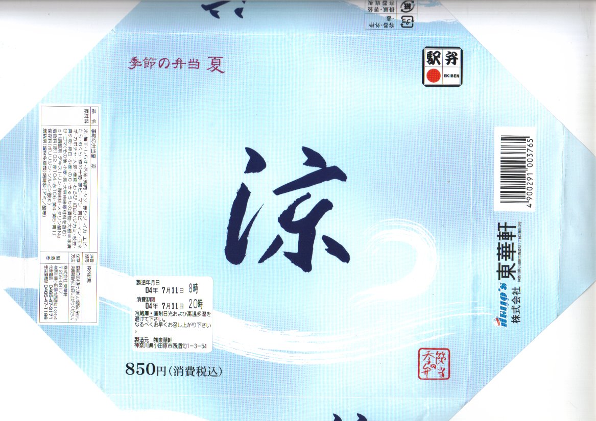 小田原駅の夏限定の駅弁。正方形の容器に空色の掛紙をかけて雲色の紙ひもでしばる、外見だけで夏いっぱいの駅弁。中身は2004(平成16)年版で、ミョウガが載った梅じゃこ御飯に海鮮団子揚やオクラ磯辺巻揚や鯵干物マリネや煮物に大根や胡瓜の漬物など。