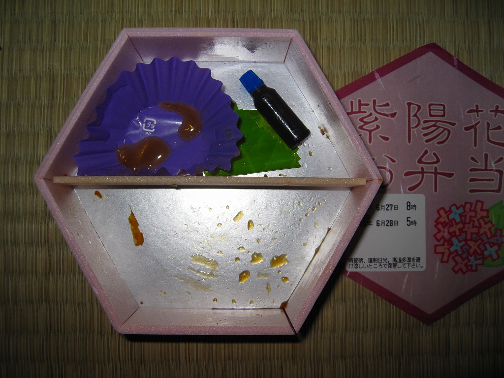 2010(平成22)年と翌年の、あじさいシーズンにのみ販売か。かつて小田原駅弁「小田原城主 姫」に使われた正六角形の容器を使用、中身は桜でんぶを振ったおいなりさん、広島菜やシソの巻寿司、オムレツ、アジフライ、レンコンやシイタケなどの煮物、ミニトマト。分量はとても少ないけれども、彩りの美しい小箱。