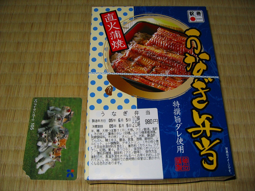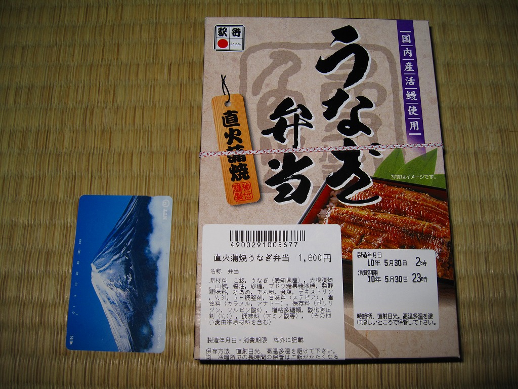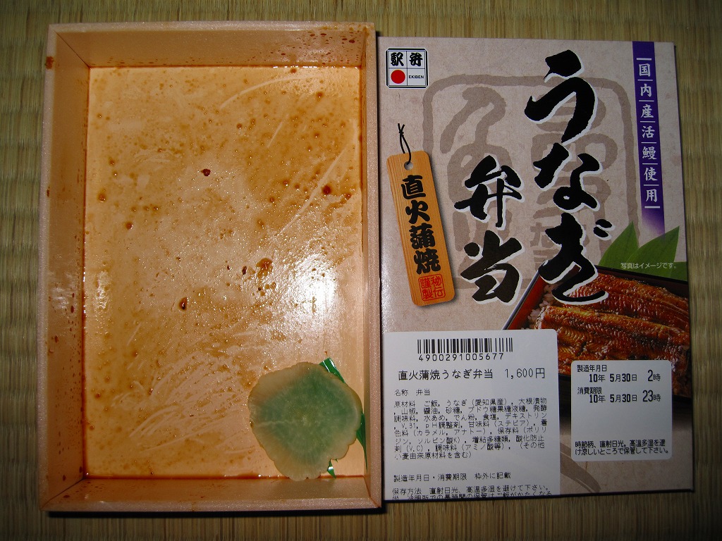 下記の駅弁「うなぎ弁当」の、2010(平成22)年時点での姿か。容器は5年前と同じままで、パッケージのデザインが変わり、中身はウナギ蒲焼が3切れから2切れに減り、大根漬物が桃色から黄色に変わり、価格が大きく上がった。