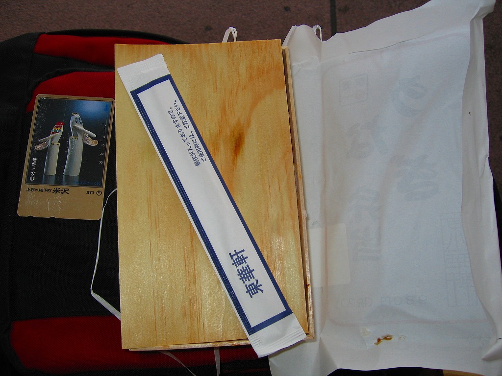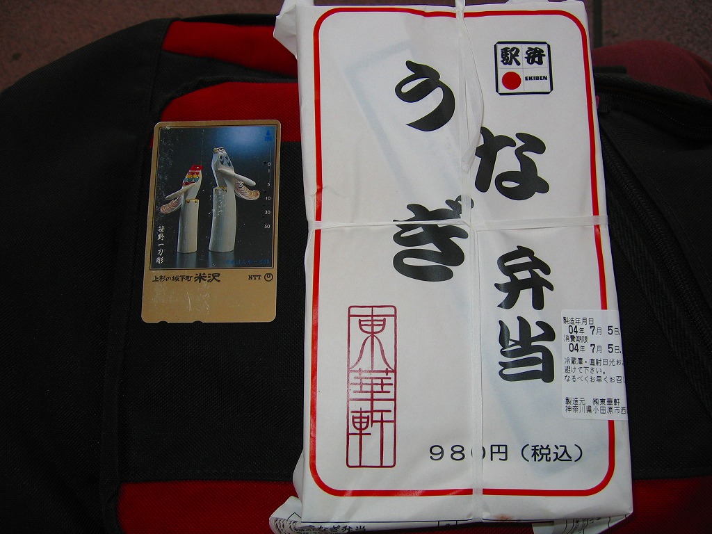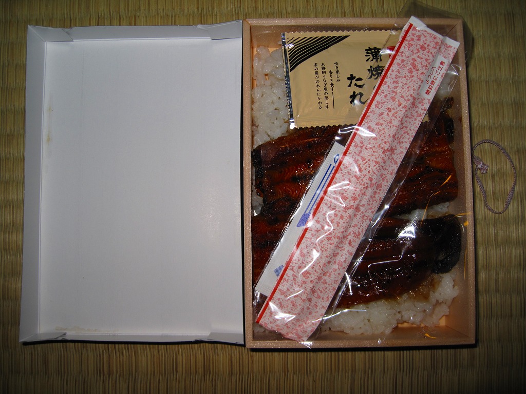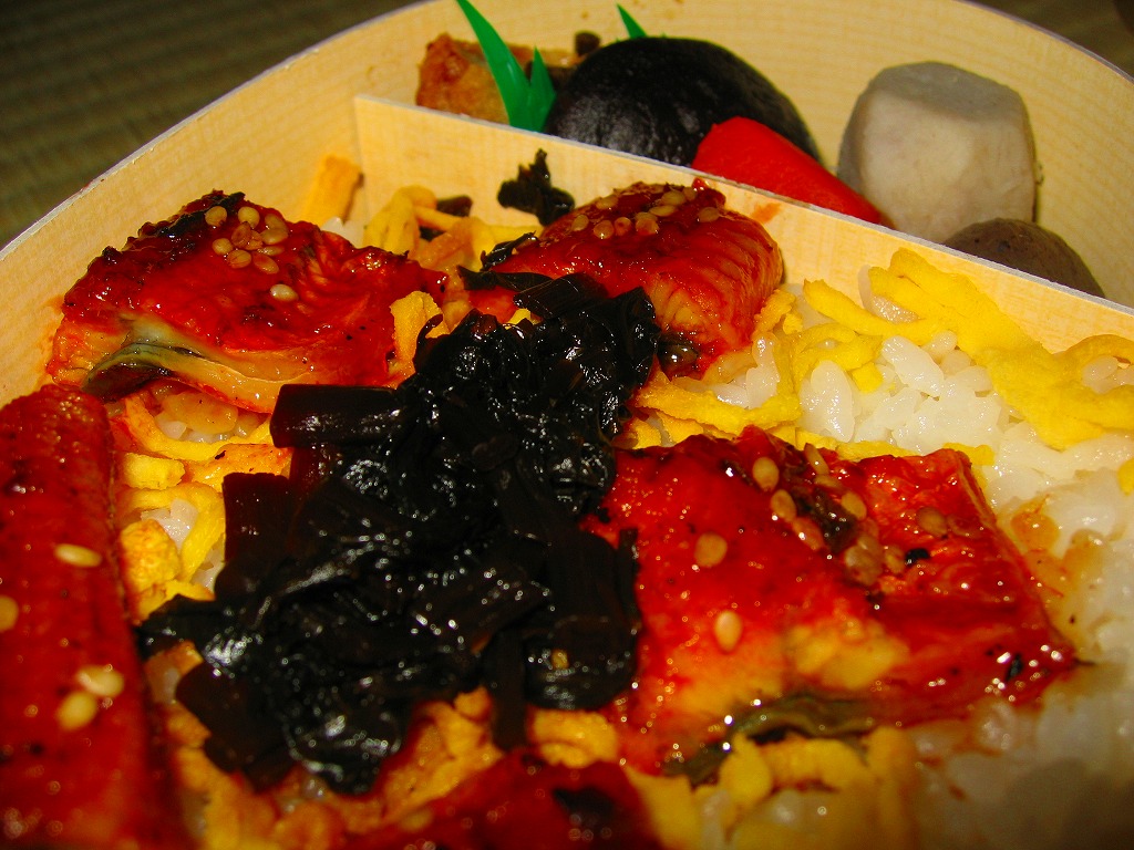 2004(平成16)年6月頃に発売の、新たな季節駅弁シリーズ。ふたの枠だけ経木でその他の部分はボール紙製の小判型容器をボール紙の枠で留める。中身はつまりウナギ弁当。写真のとおり、鰻重でもなく、ひつまぶしでもなく、分量をケチったと見られそうな鰻蒲焼の分量と配置は、稚魚不漁によるウナギ高騰の影響か。価格も前年より30円アップ。煮物も含めた品質は良かった。
