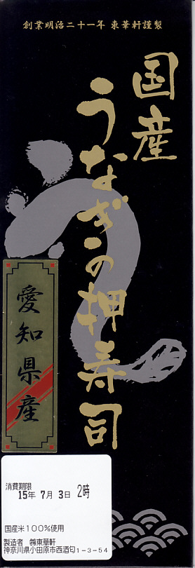 2012(平成24)年の発売か。当時はウナギとアナゴの押寿司と高菜巻とシソ巻で、2014(平成26)年からこの姿になった模様。真っ黒なボール紙でふたをした細長い容器に、タレに染まる酢飯に薄いウナギ蒲焼を貼り付けたウナギ押寿司が6切れ分と、シソ巻が1個と、山椒味噌を詰める。ウナギの高騰で仕方がないのだが、味も香りも食感も感じられない少量が悲しい。2015年までの販売か。