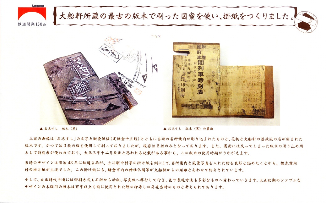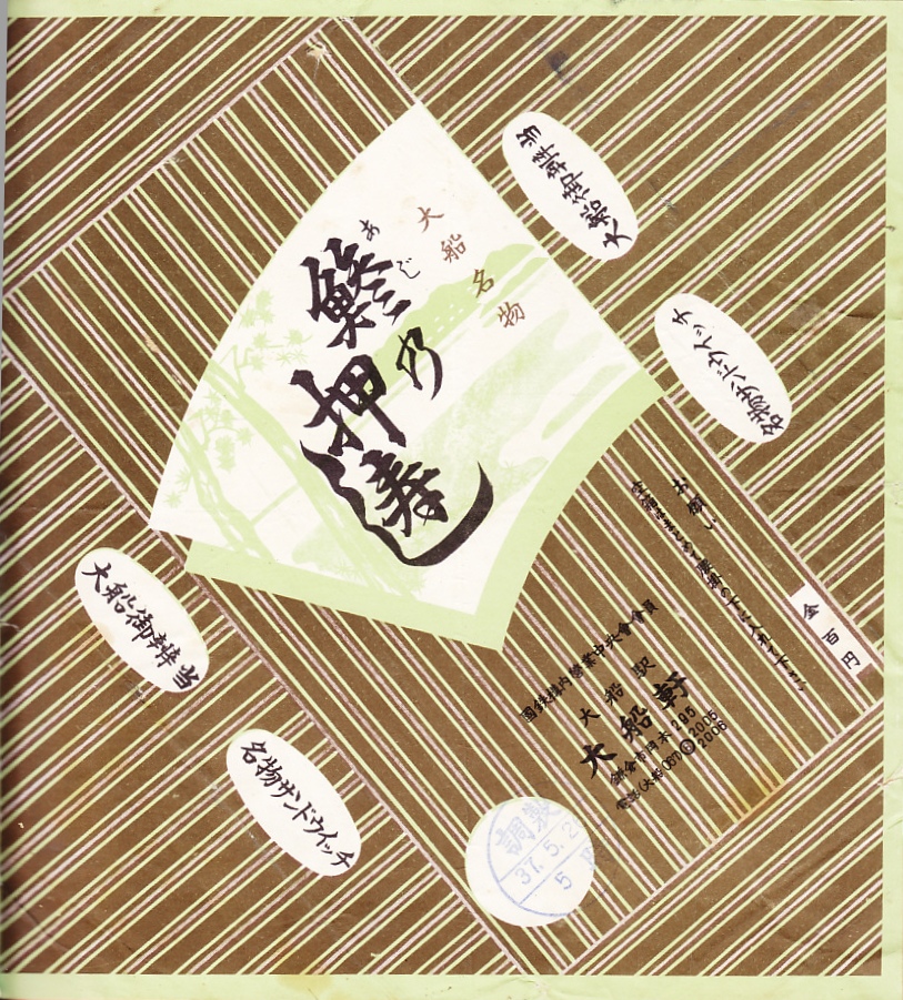 1980年代前半、昭和50年代後半のものと思われる、昔の大船駅弁の掛紙。かつて正方形だった掛紙が長方形に変化。この絵柄は2012(平成24)年まで受け継がれた。国鉄の旅行キャンペーン「いい日旅立ち」のロゴマークを重ね、大船、藤沢、茅ヶ崎、戸塚、鎌倉、本郷台、東戸塚、逗子の駅名を列記した。