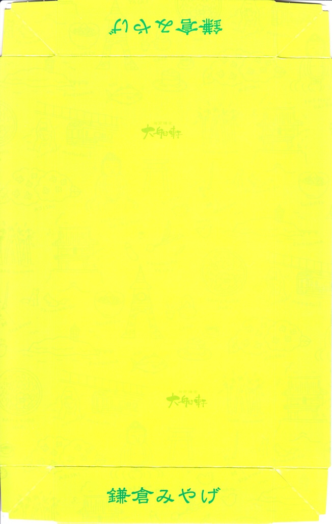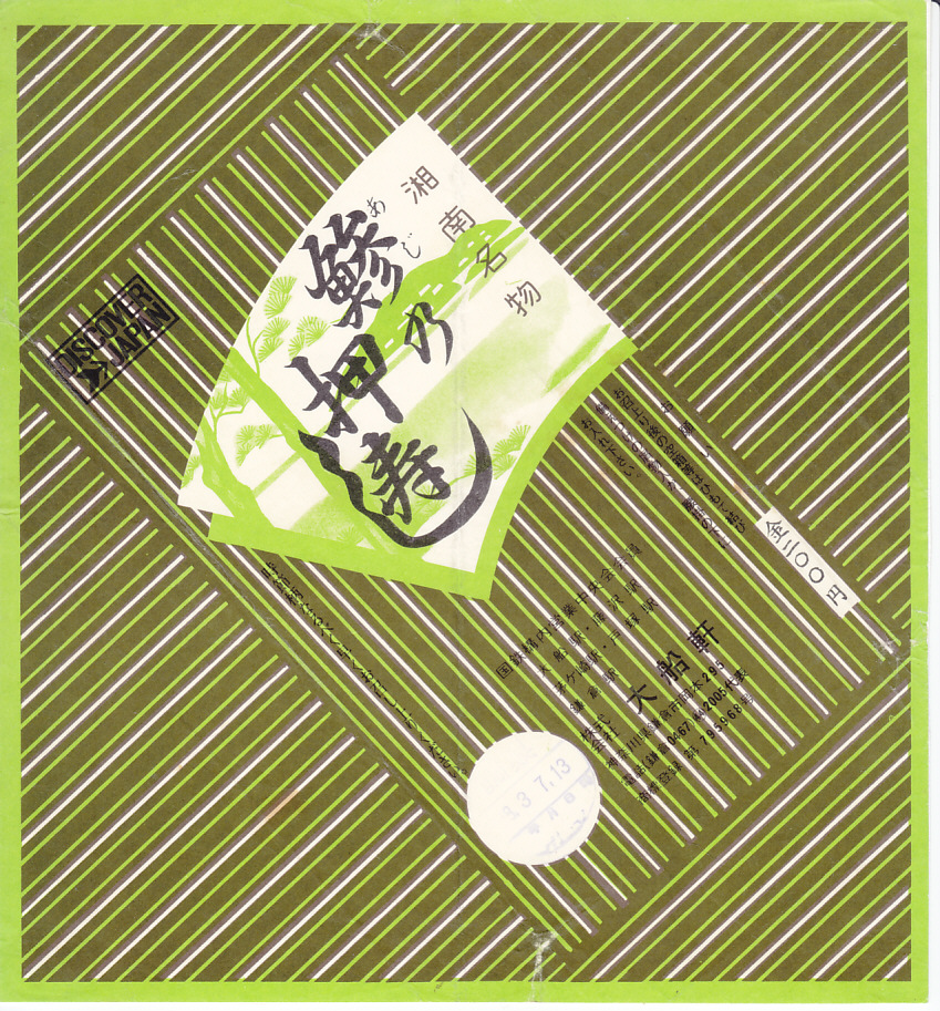 1973(昭和48)年3月7日13時の調製と思われる、昔の大船駅弁の掛紙。下記の1962年のものと比べて、茶色が緑色になった感じ。これは経年による劣化や退色でなく、色合いを変えたものだろう。大船駅に加えて、藤沢、茅ヶ崎、戸塚、鎌倉の駅名も列記され、扇の中の「大船名物」を「湘南名物」と改めた。