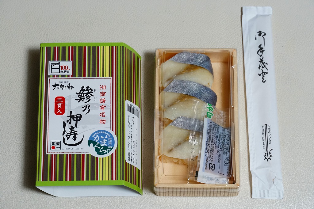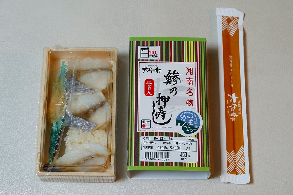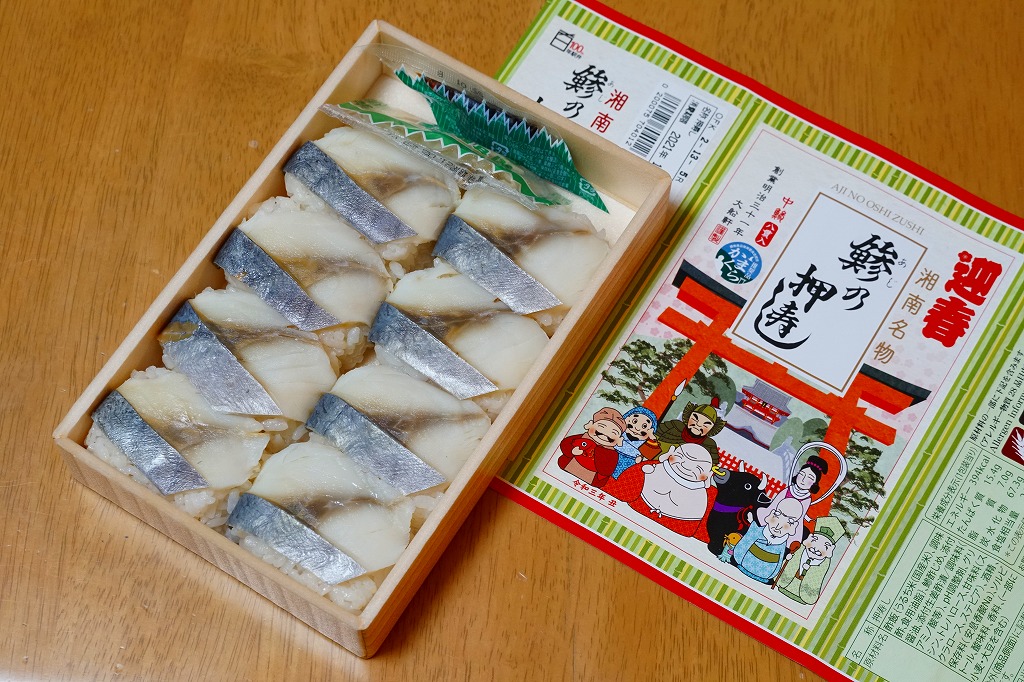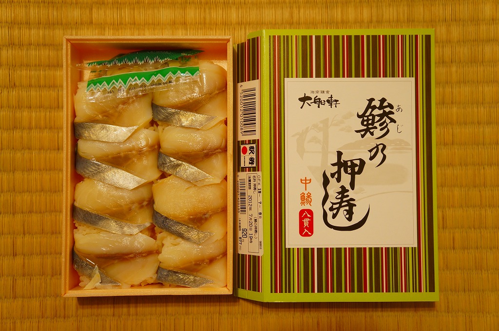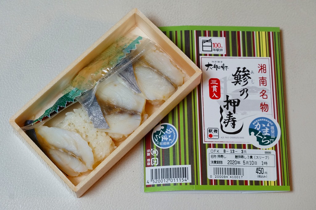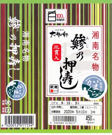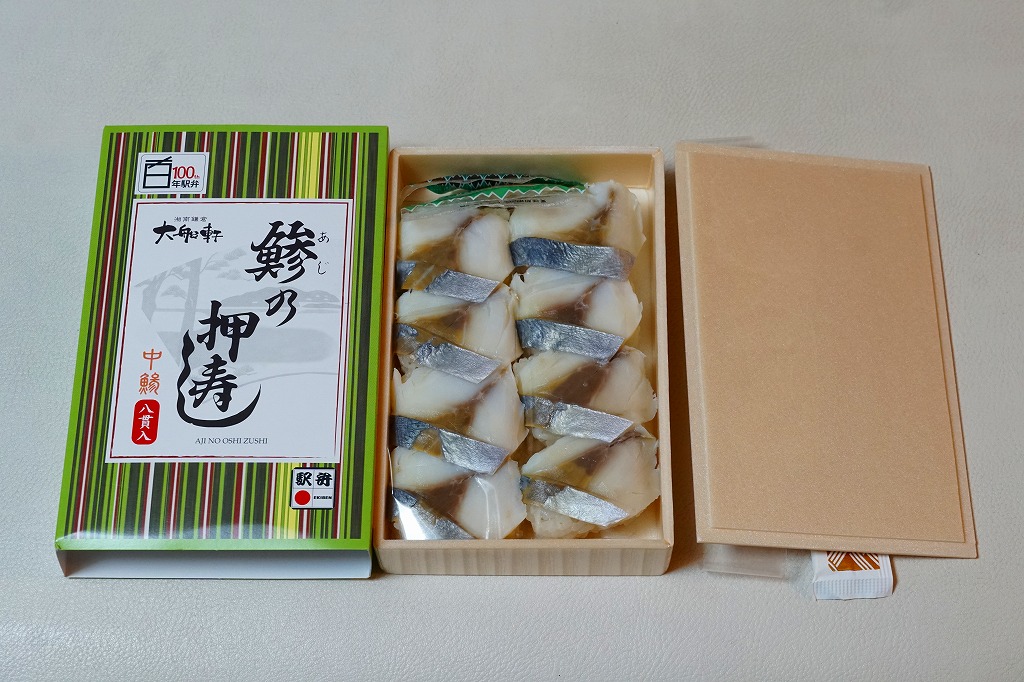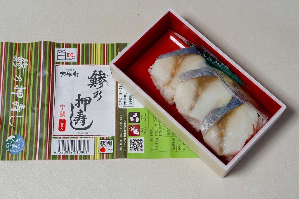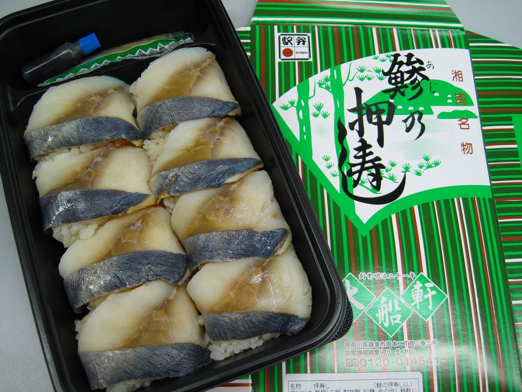 1913(大正2)年4月に大船駅で発売された、伝統の駅弁。実際には「特上鯵の押寿し」がその原型であり、こちらは相模湾でアジが当時ほど獲れなくなってからの廉価版として後年に出てきたのではないかと思う。軽食から酒のつまみまで、2013年現在で一日あたり約1,500個が売れているという。