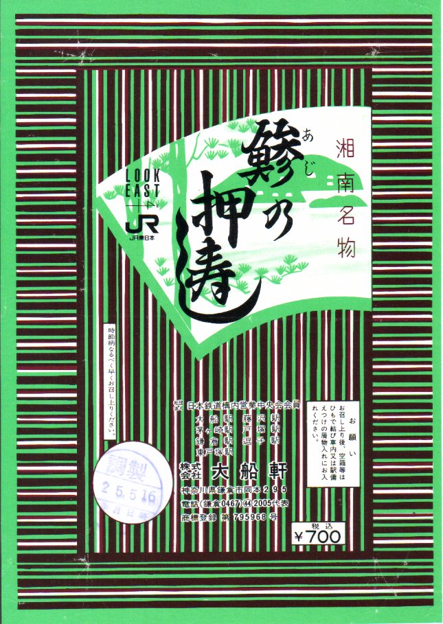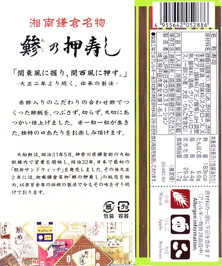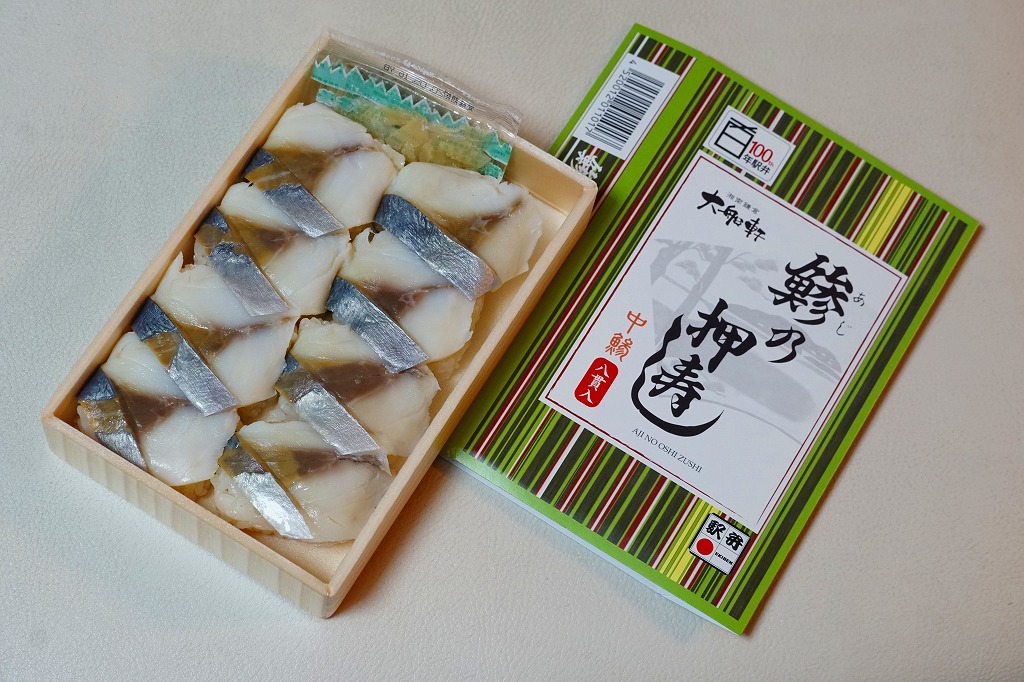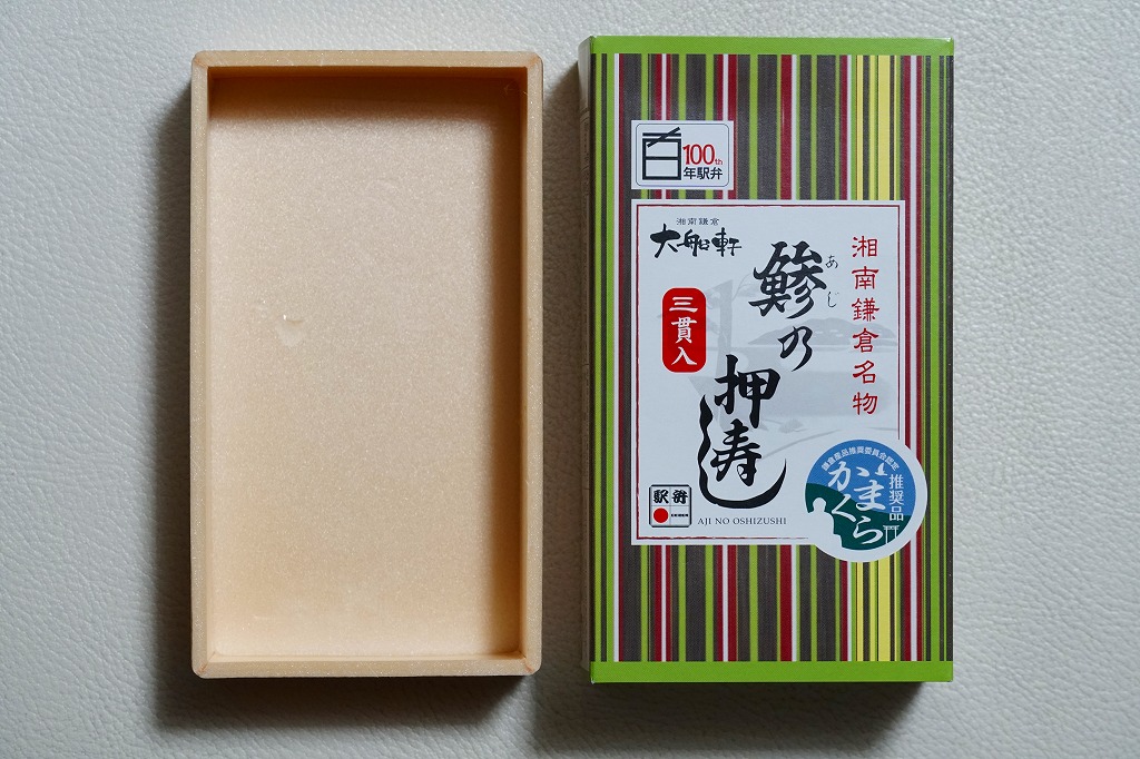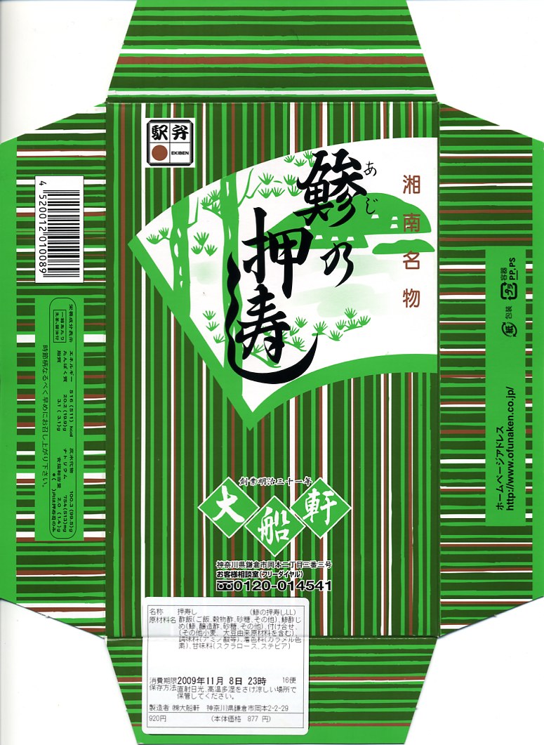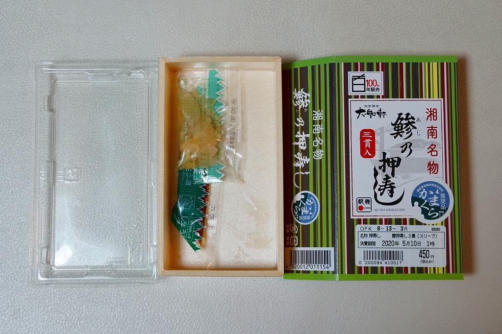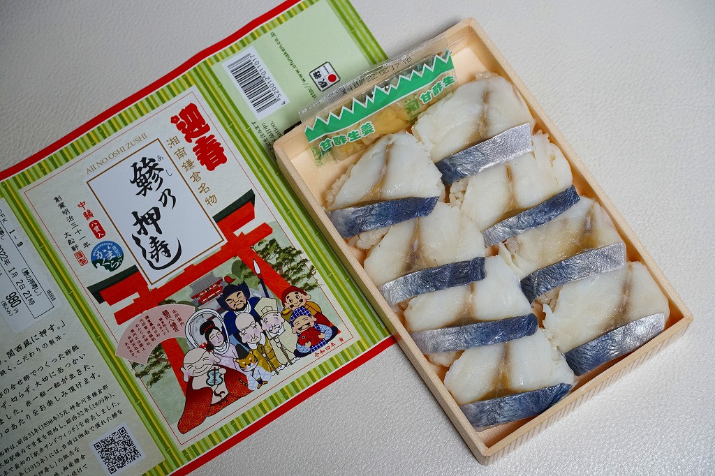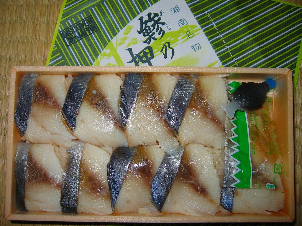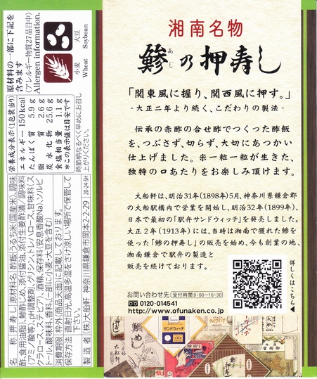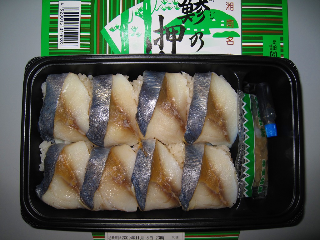 1913(大正2)年4月に大船駅で発売された、伝統の駅弁。実際には「特上鯵の押寿し」がその原型であり、こちらは相模湾でアジが当時ほど獲れなくなってからの廉価版として後年に出てきたのではないかと思う。軽食から酒のつまみまで、2013年現在で一日あたり約1,500個が売れているという。