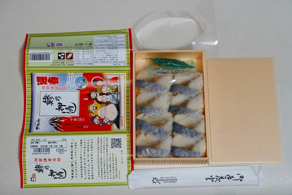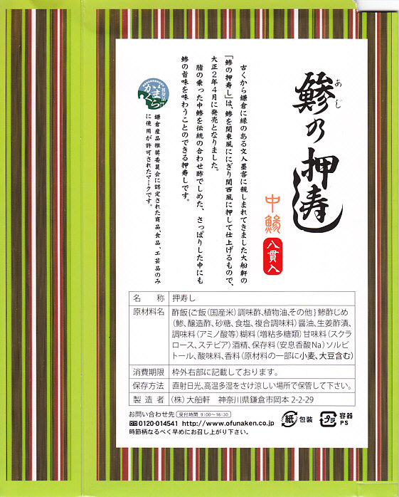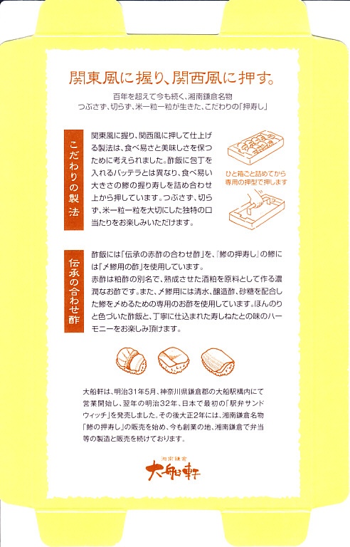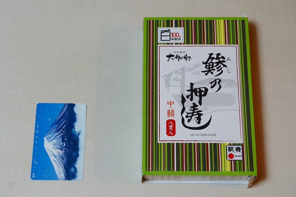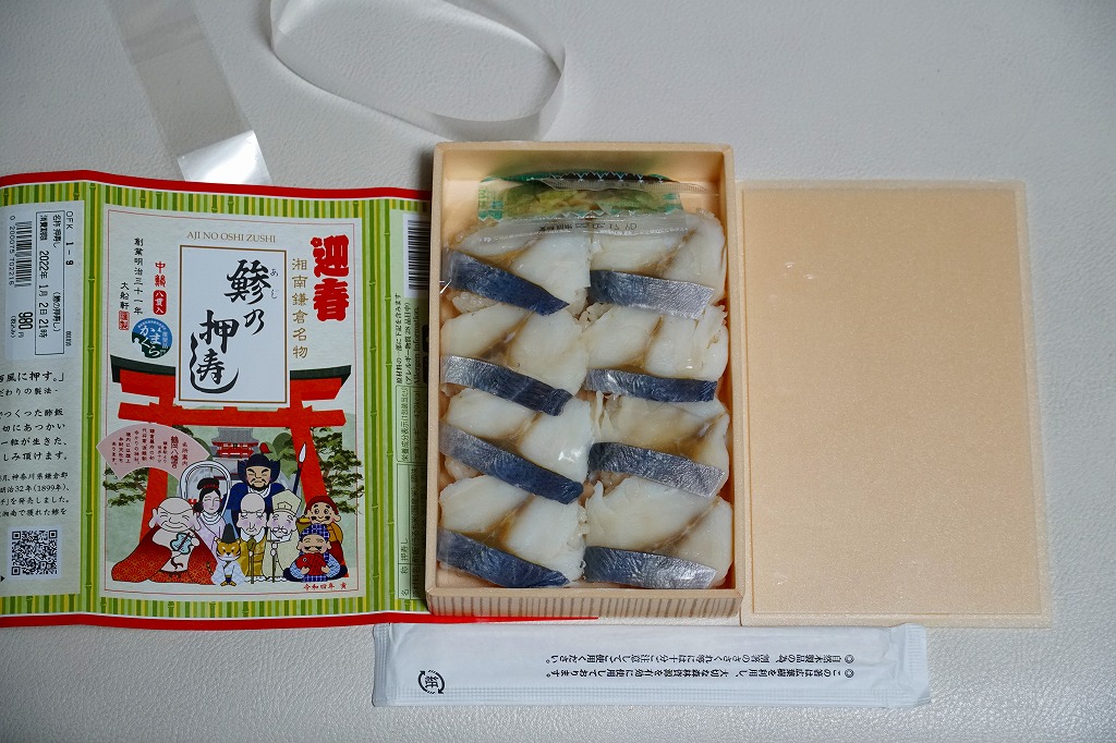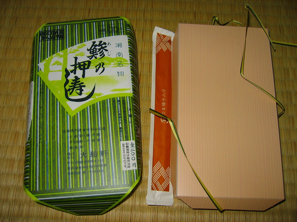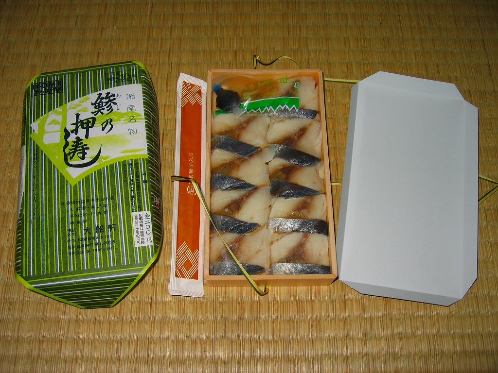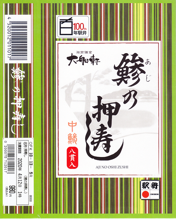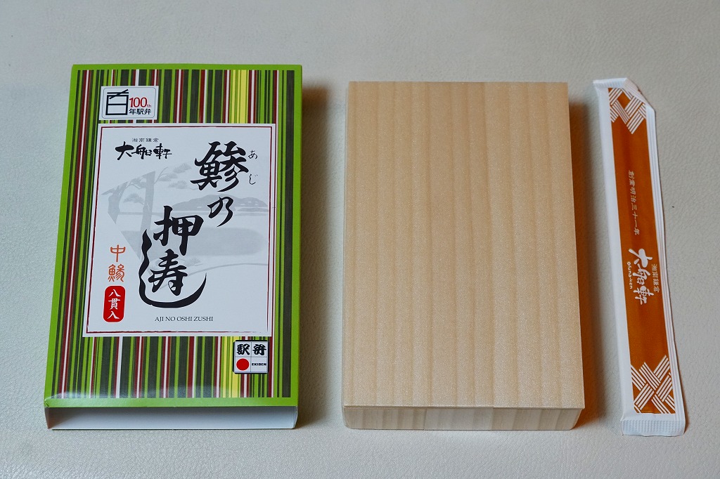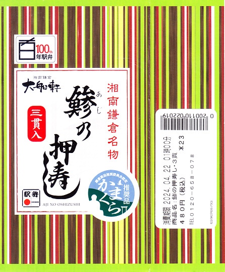1913(大正2)年4月に大船駅で発売された、伝統の駅弁。実際には「特上鯵の押寿し」がその原型であり、こちらは相模湾でアジが当時ほど獲れなくなってからの廉価版として後年に出てきたのではないかと思う。軽食から酒のつまみまで、2013年現在で一日あたり約1,500個が売れているという。