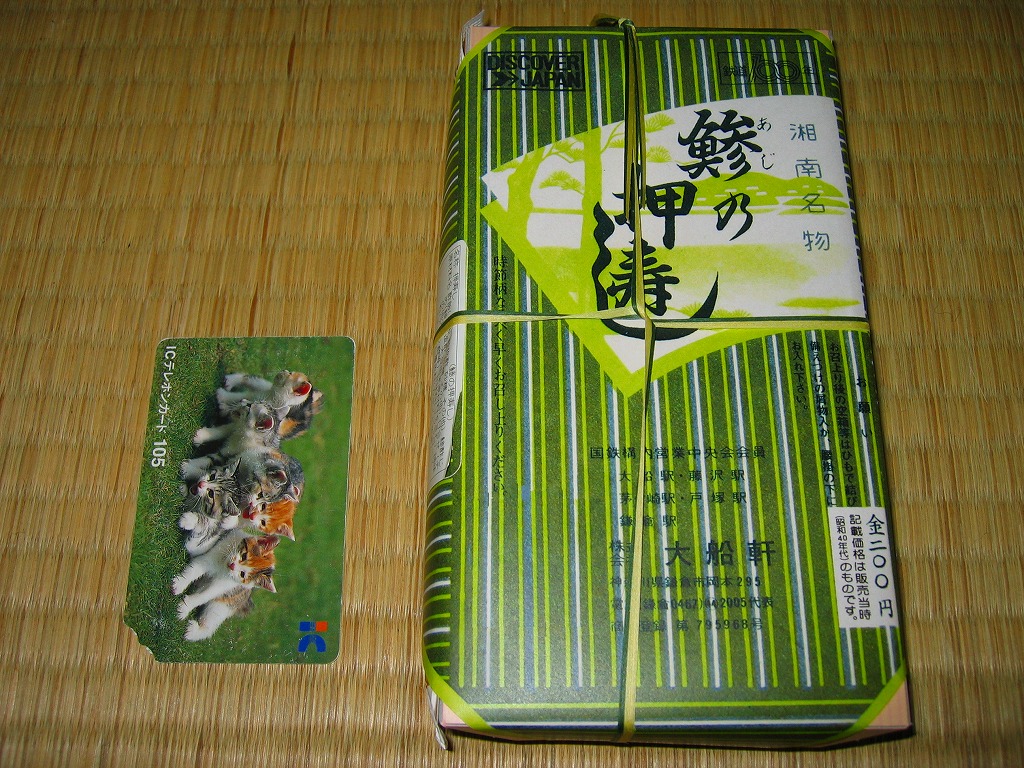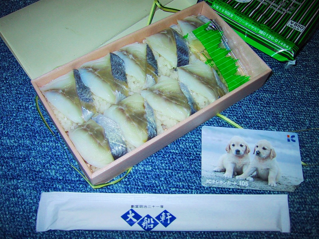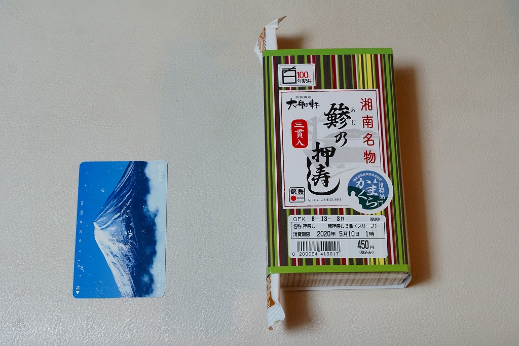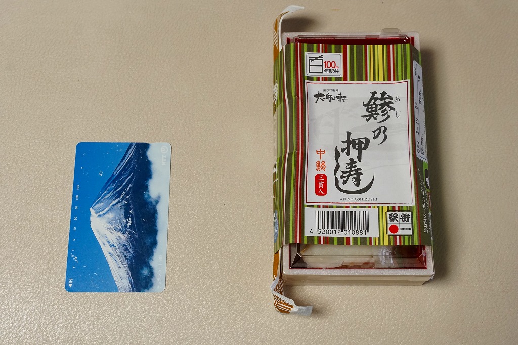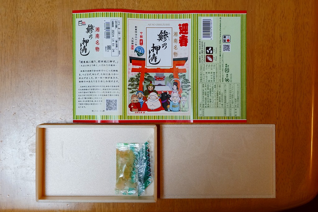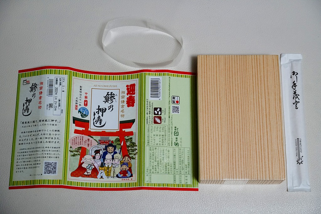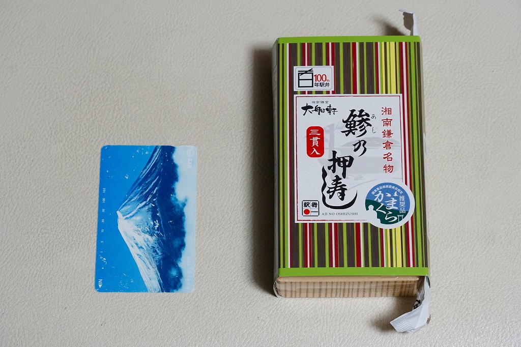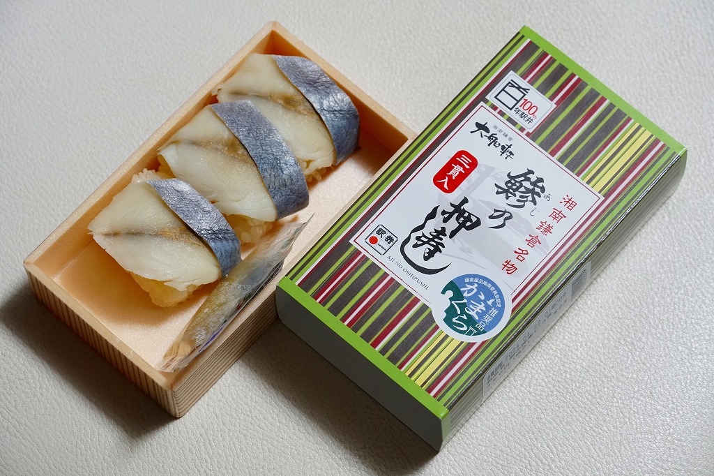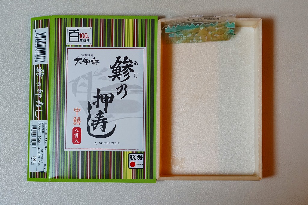 1913(大正2)年4月に大船駅で発売された、伝統の駅弁。実際には「特上鯵の押寿し」がその原型であり、こちらは相模湾でアジが当時ほど獲れなくなってからの廉価版として後年に出てきたのではないかと思う。軽食から酒のつまみまで、2013年現在で一日あたり約1,500個が売れているという。