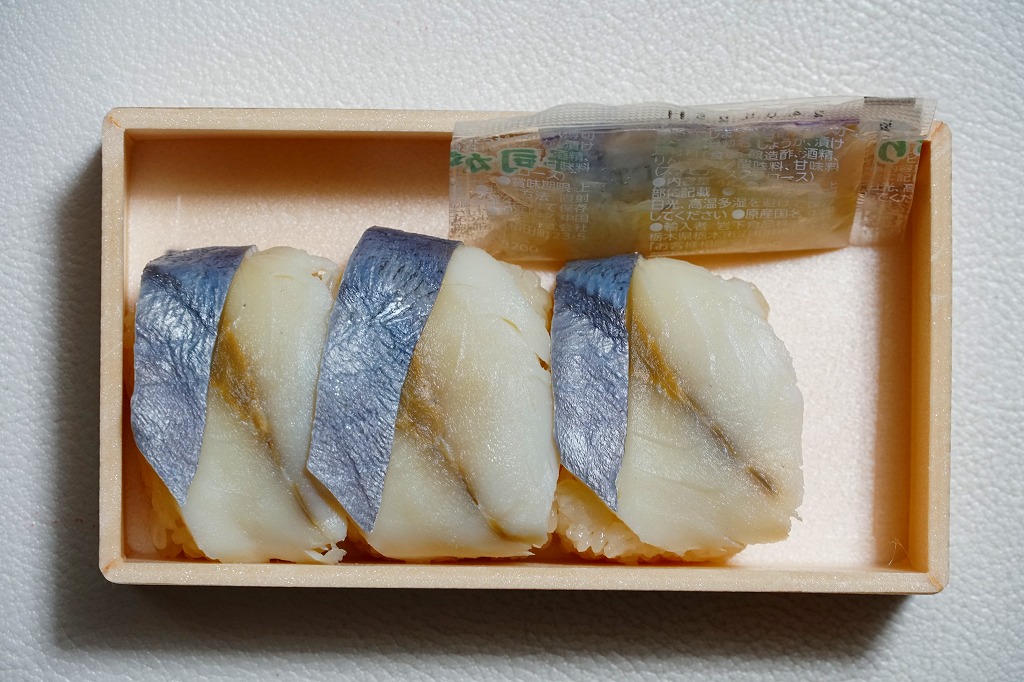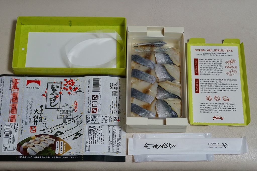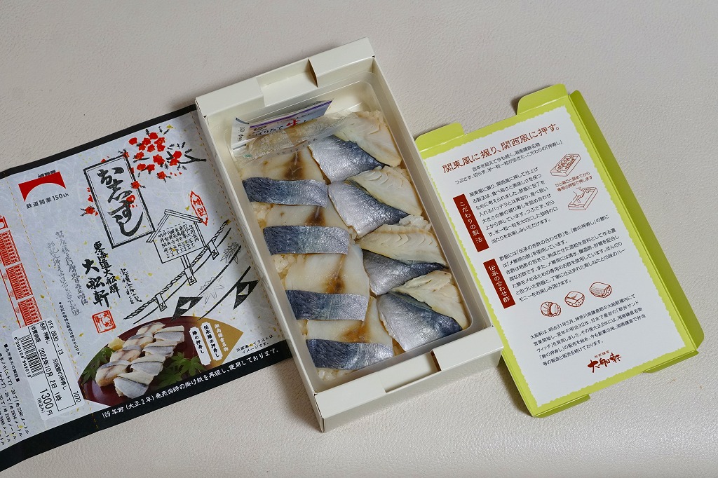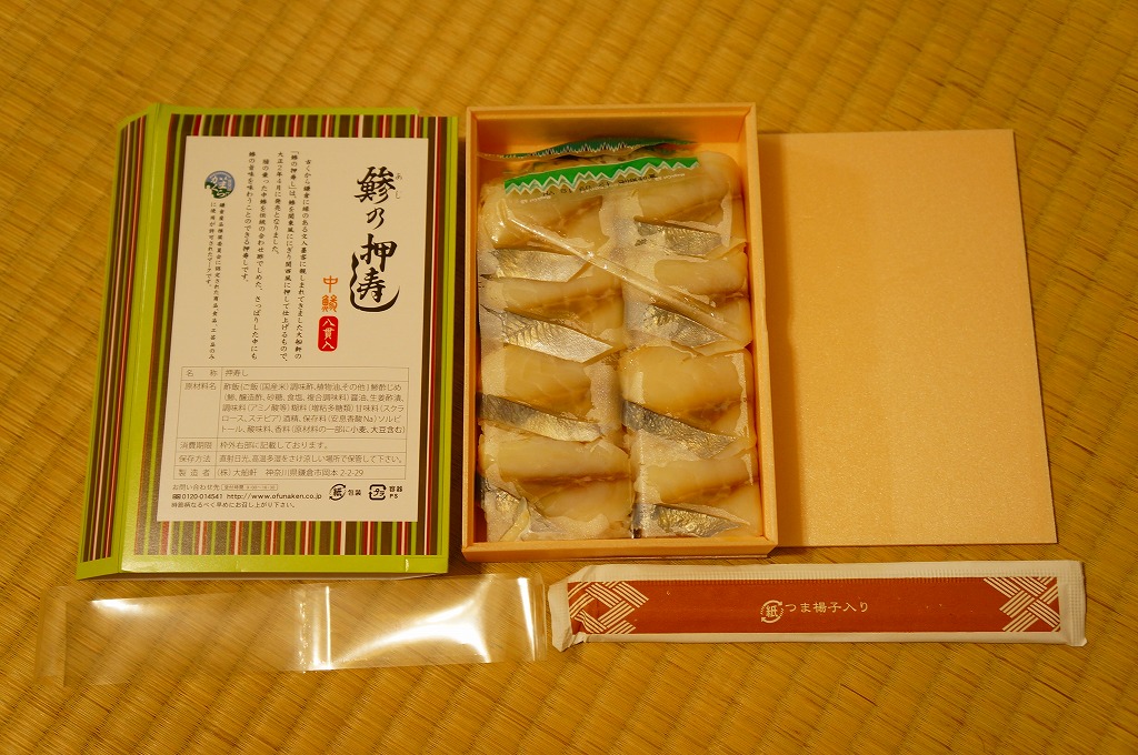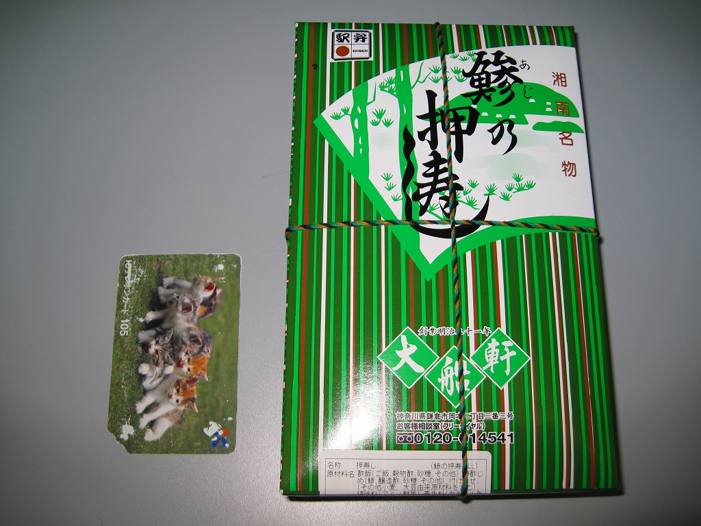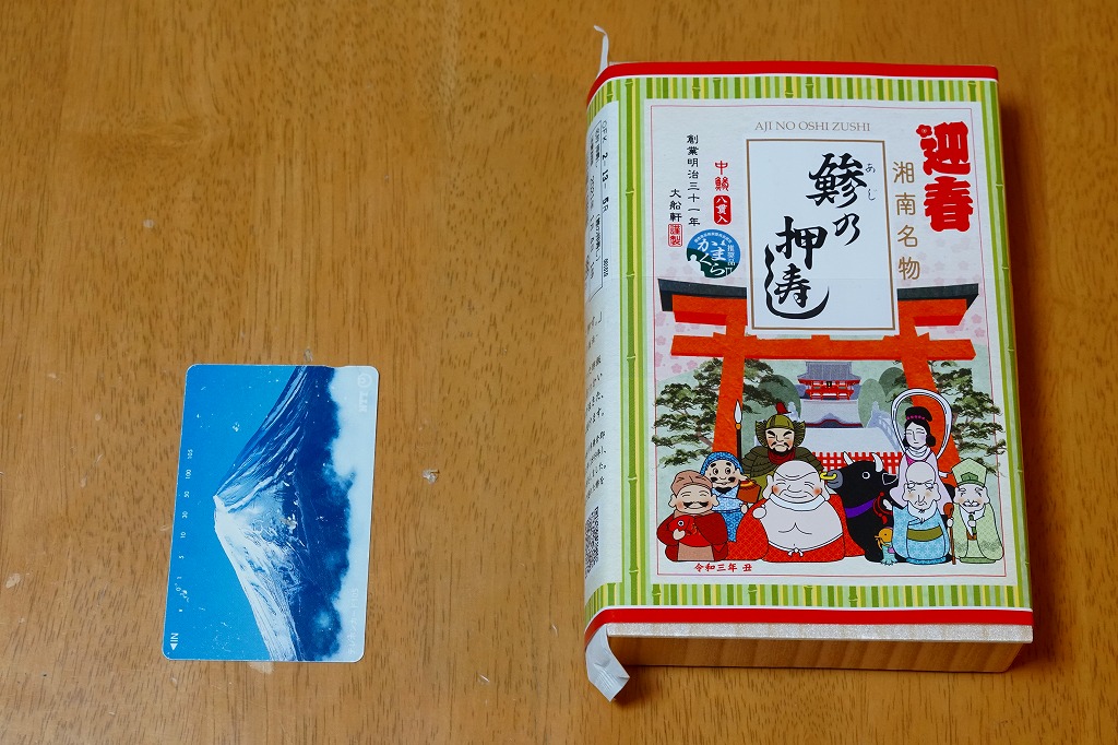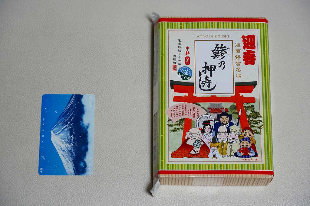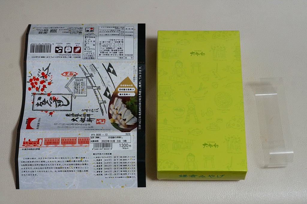 1913(大正2)年4月に大船駅で発売された、伝統の駅弁。実際には「特上鯵の押寿し」がその原型であり、こちらは相模湾でアジが当時ほど獲れなくなってからの廉価版として後年に出てきたのではないかと思う。軽食から酒のつまみまで、2013年現在で一日あたり約1,500個が売れているという。