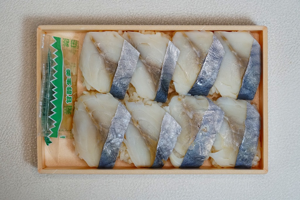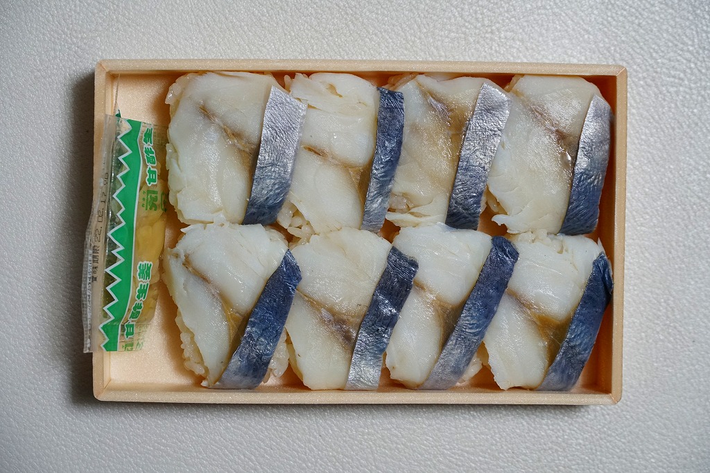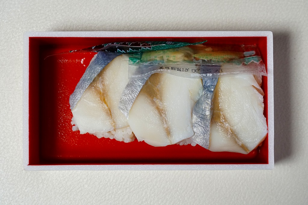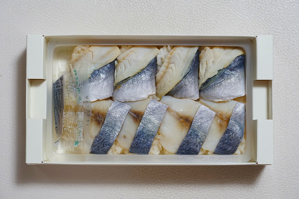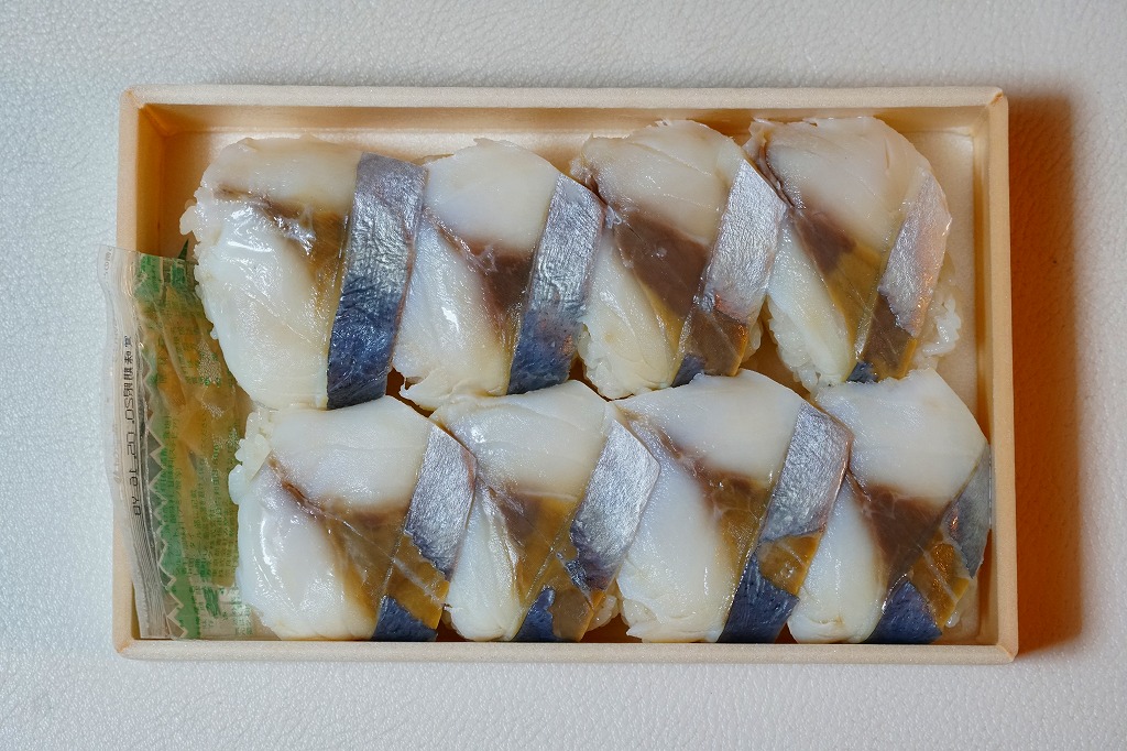 薄く平たい長方形の容器に、九州で水揚げされたマアジのLサイズ「中あじ」をスライスしたものを酢飯に巻き付ける押し寿司というか握り寿司が一口サイズで8個整列し、甘酢生姜と醤油の袋を詰める。