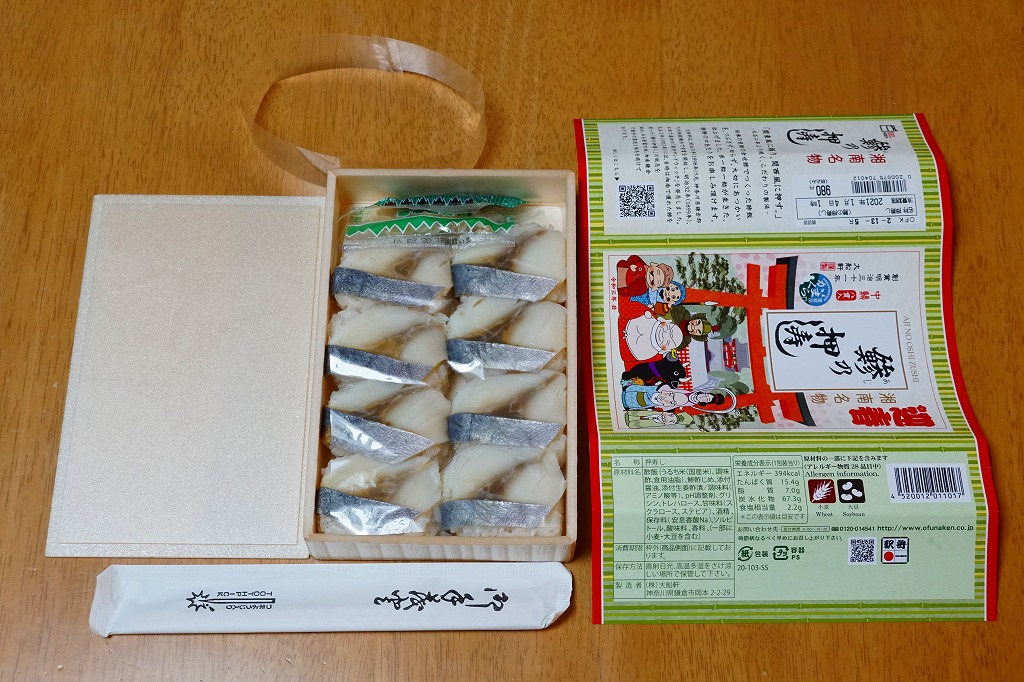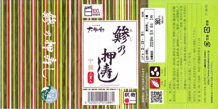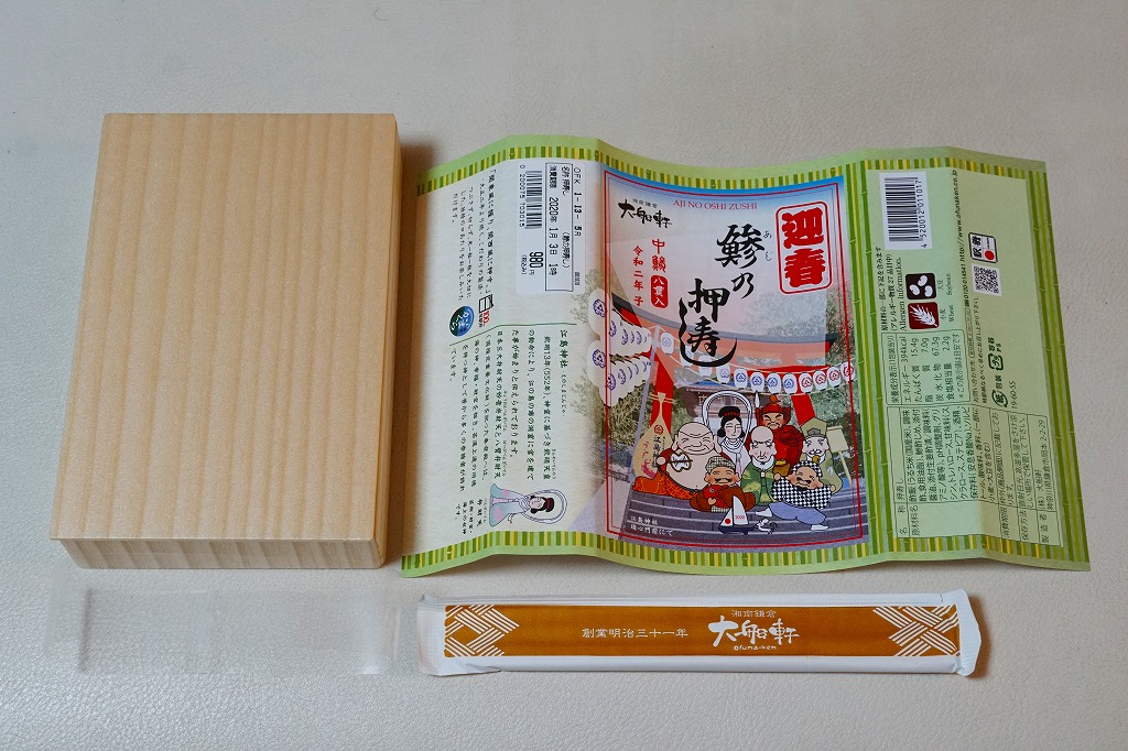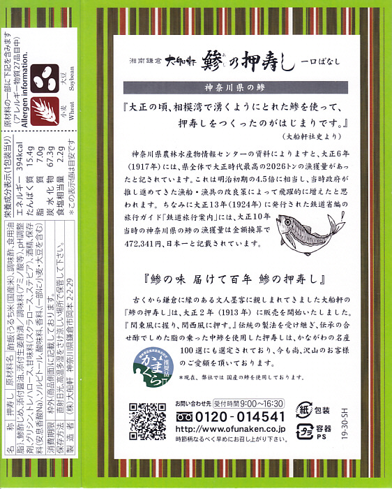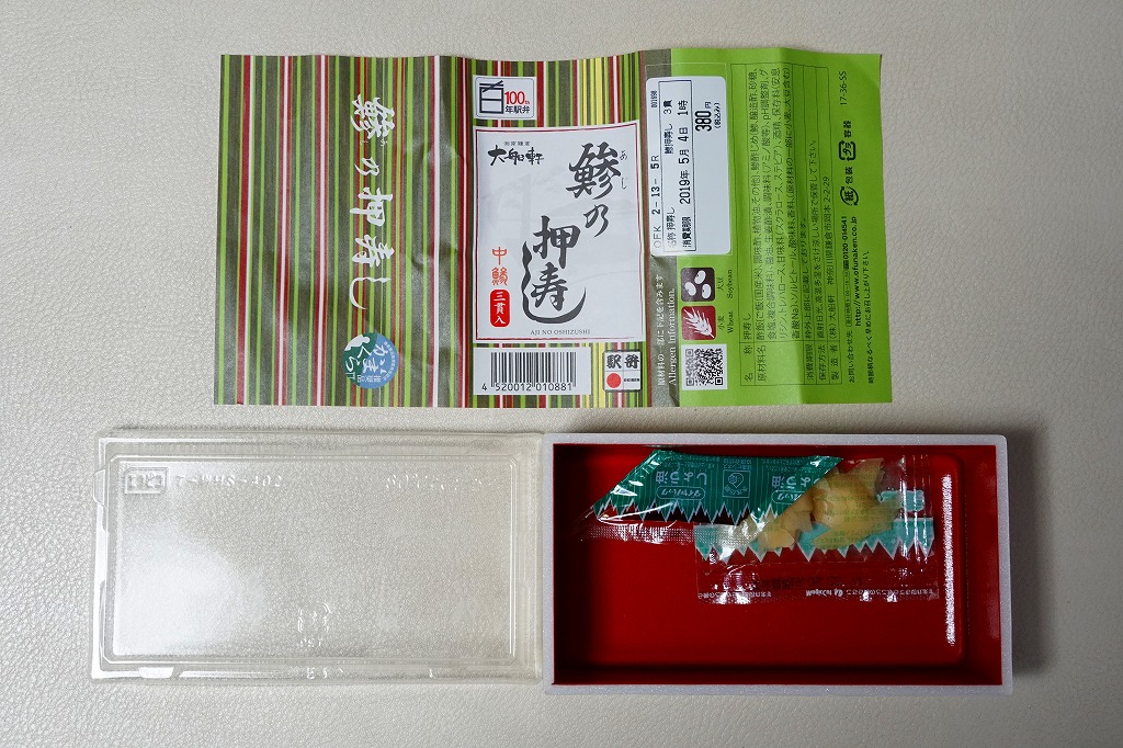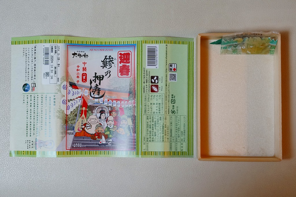 2019(令和元)年5月3日に購入した、大船駅弁の掛紙。鯵の押寿しの3個入りのレギュラー発売当時は、スリーブでなく掛紙を使用していた。容器や中身は、上記の2020年のものと変わらない。