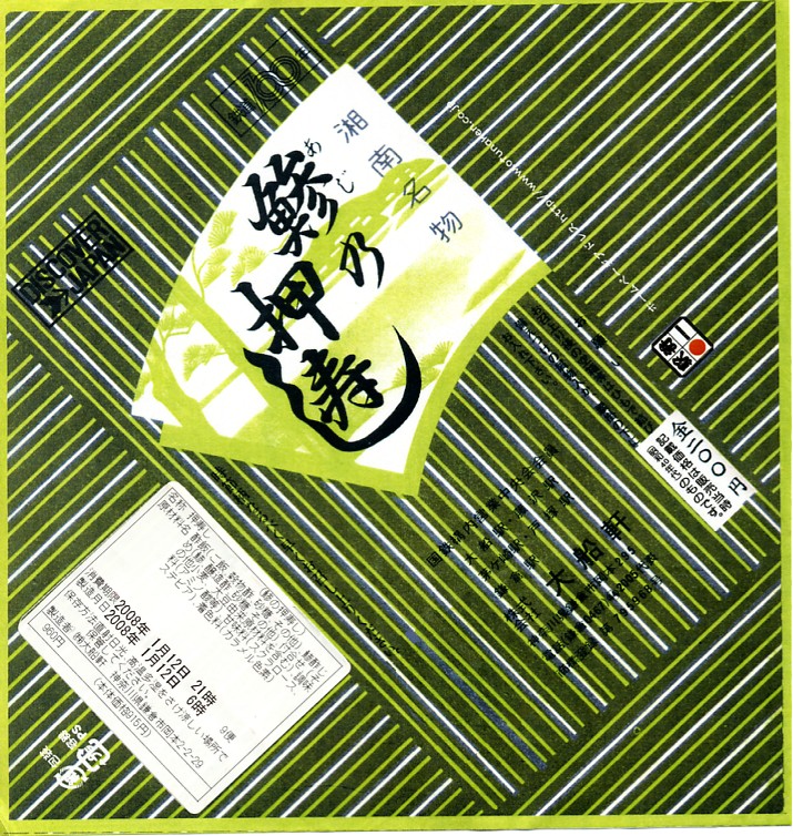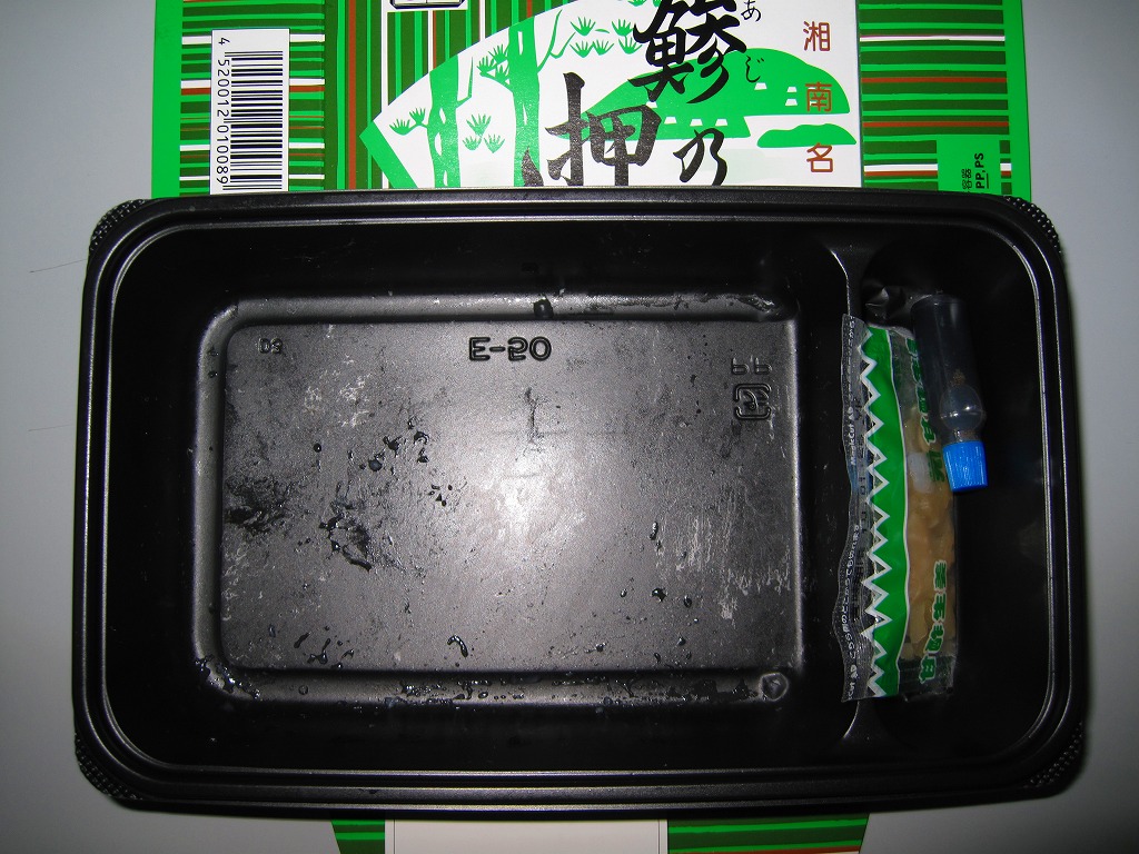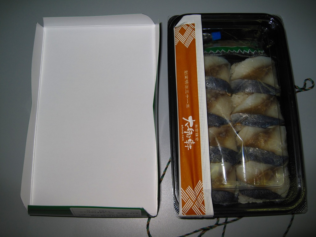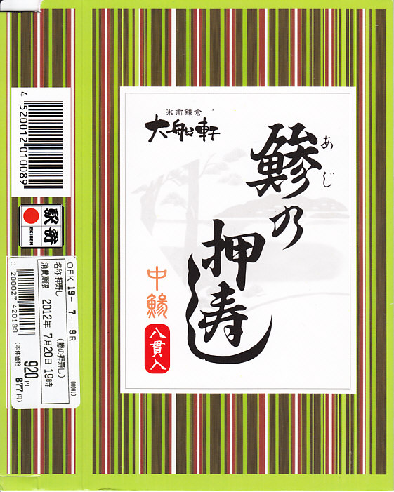 大船駅の名物駅弁である「鯵の押寿し」のパッケージ違い。お惣菜用の黒いプラ製トレーに透明なふたをはめて、割りばしを添えてボール紙の掛紙の載せて、ひもで十字にしばる。調製元の公式サイトによると、通常のものが9個入り960円で「駅売タイプ」、こちらが8個入り920円で「発送可」と紹介されている。中身は同じはずだけれども、こちらはスーパーの惣菜のようで、なんとなく味気ない。2012年7月に「鯵の押寿し中鯵」へリニューアル。