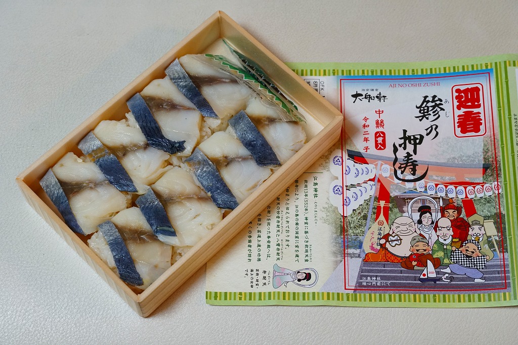 大船軒の創業120年を記念し、2018(平成30)年5月16日から20日まで1,700個を120円で販売、後に380円で売られるようになっていた、大船駅の名物駅弁「鯵の押寿し」の3個入りバージョン。鯵の押寿しをたった3個だけ詰めた小箱を、通常版と同じ絵柄のスリーブに収める。価格は2020年時点で450円、2024年時点で480円、2025年2月から500円。