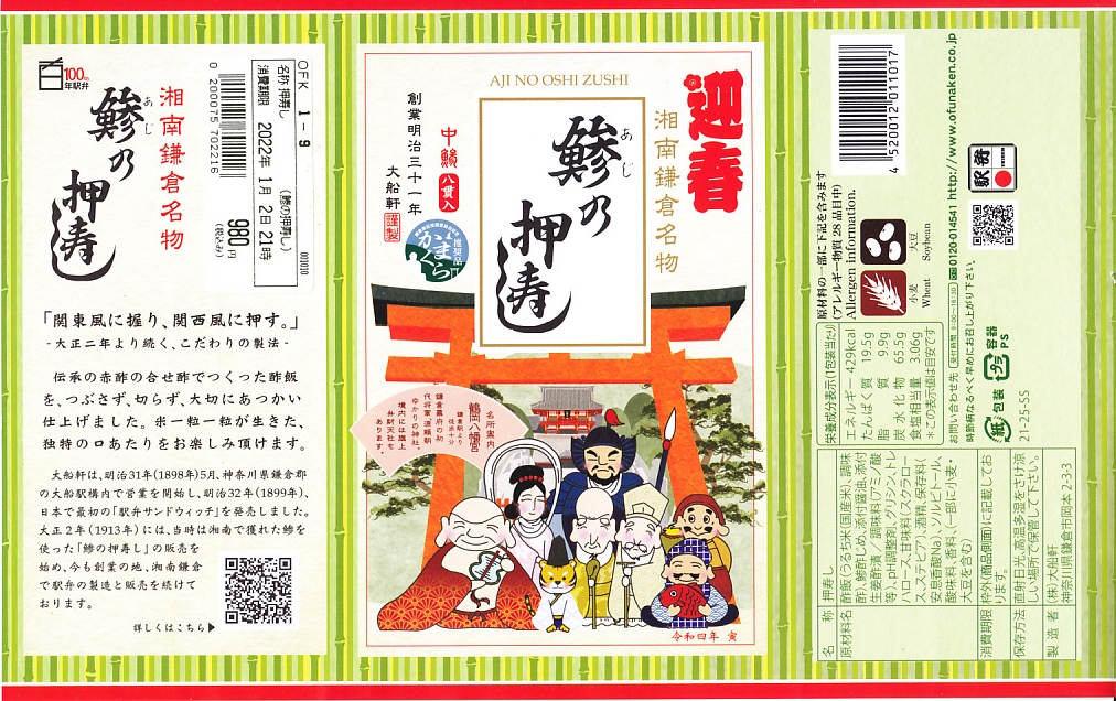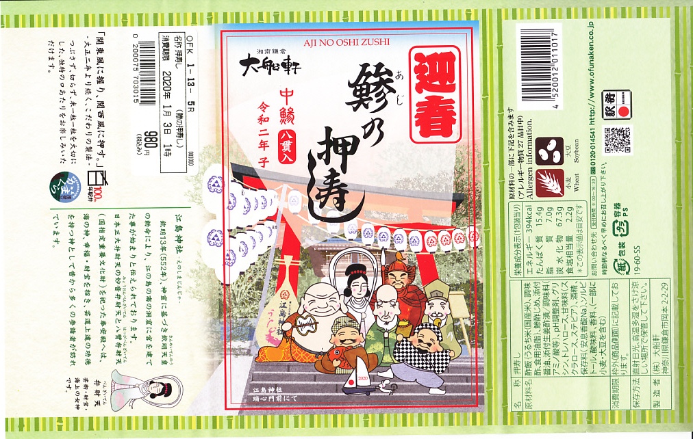 2021(令和3)年1月3日に購入した、大船駅弁の掛紙。年末年始の短い期間、毎年12月31日頃から1月4日頃まで、大船駅弁の鯵の押寿しは普段のスリーブでなく、この新春掛紙あるいは迎春掛紙で販売される。この令和3年版は、干支の黒い牛に旧年と同じ七福神が、鶴岡八幡宮と思われる神社を背景に勢揃い。今回が12年目で、5,000個の販売だそうな。
