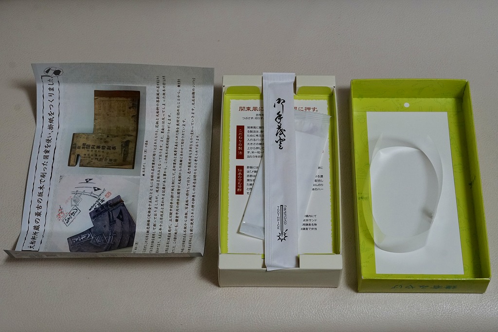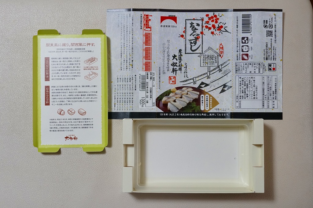 2020(令和2)年5月9日に購入した、大船駅弁のスリーブ。上記の2024年のものと、書いてあることは同じ。容器と中身はまったく同じ。当時は大船駅前で調製される大船駅弁であり、2023年6月からは埼玉県で調製される大船軒ブランドの商品であり、記載内容をよく見比べるとその差異が現れている。