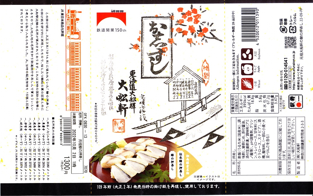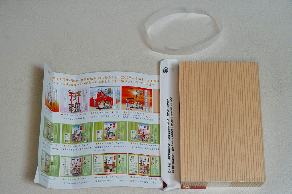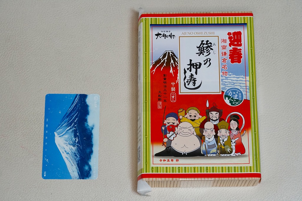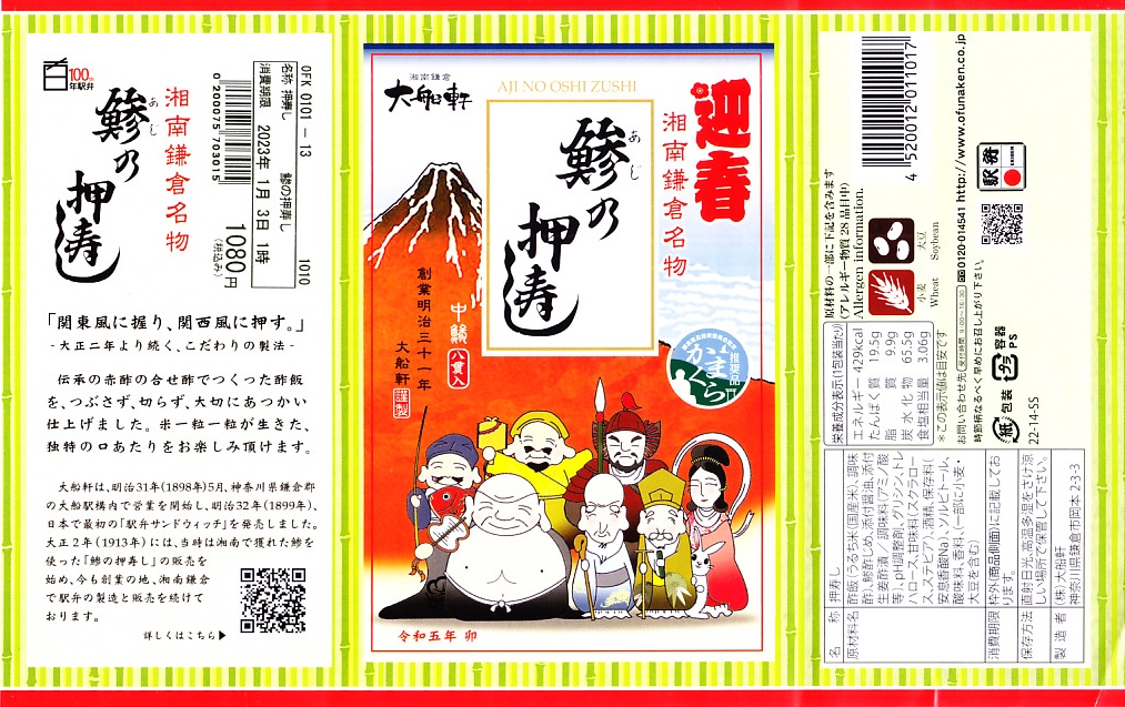 2023(令和5)年1月2日に購入した、大船駅弁の掛紙。年末年始の短い期間、今回は12月31日から1月7日まで、大船駅弁の鯵の押寿しは普段のスリーブでなく、この新春掛紙あるいは迎春掛紙で販売される。この令和5年版は、赤富士を背景に七福神を描いた。加えて裏面には過去14年分の迎春掛紙を縮小印刷。昨年8月に大船軒のJR東日本クロスステーションへの合併と鎌倉市大船の製造拠点の操業終了が発表されており、これが最後の迎春掛紙になるのではないかと、不吉に思えた目出度い掛紙。実際にこの年で迎春掛紙シリーズは最後になってしまった。