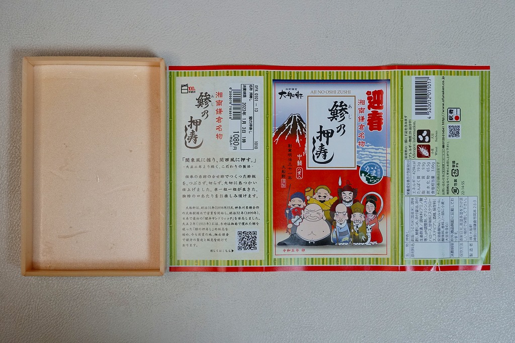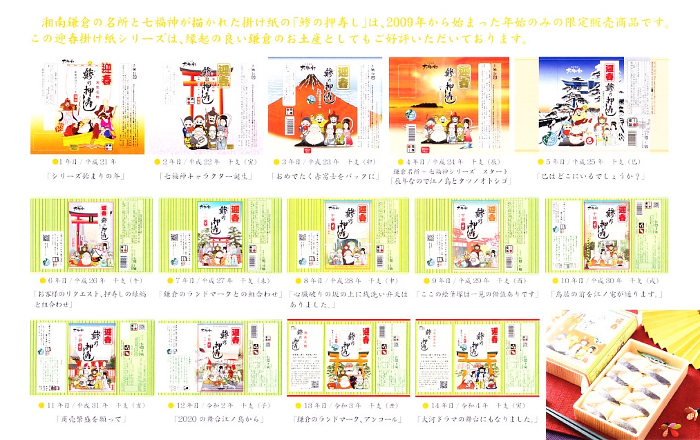 2022(令和4)年1月2日に購入した、大船駅弁の掛紙。年末年始の短い期間、毎年12月31日頃から1月4日頃まで、大船駅弁の鯵の押寿しは普段のスリーブでなく、この新春掛紙あるいは迎春掛紙で販売される。この令和4年版は、今回は鶴岡八幡宮と記した神社を背景に、旧年と同じ七福神が立ち位置を変え、真ん中に干支のトラを据えて勢揃い。