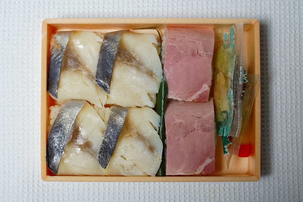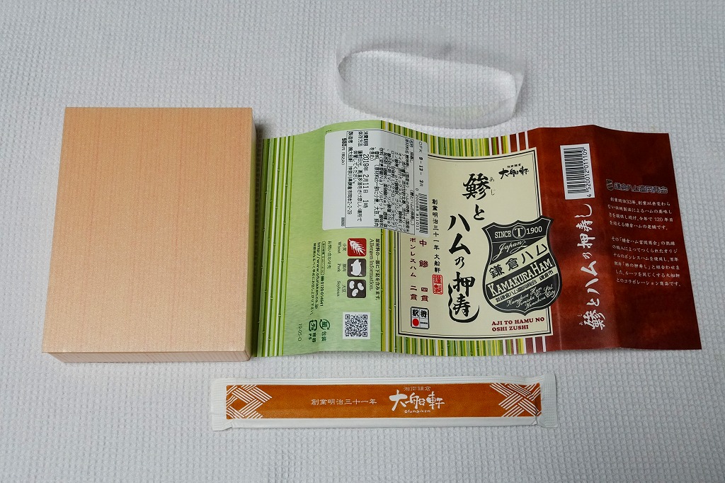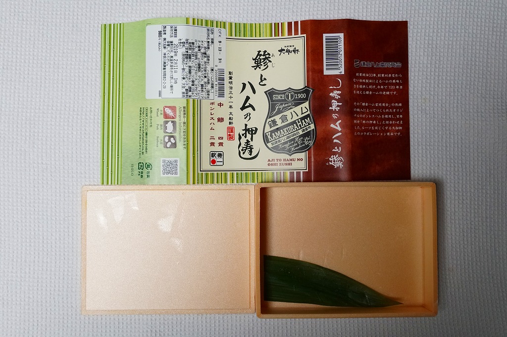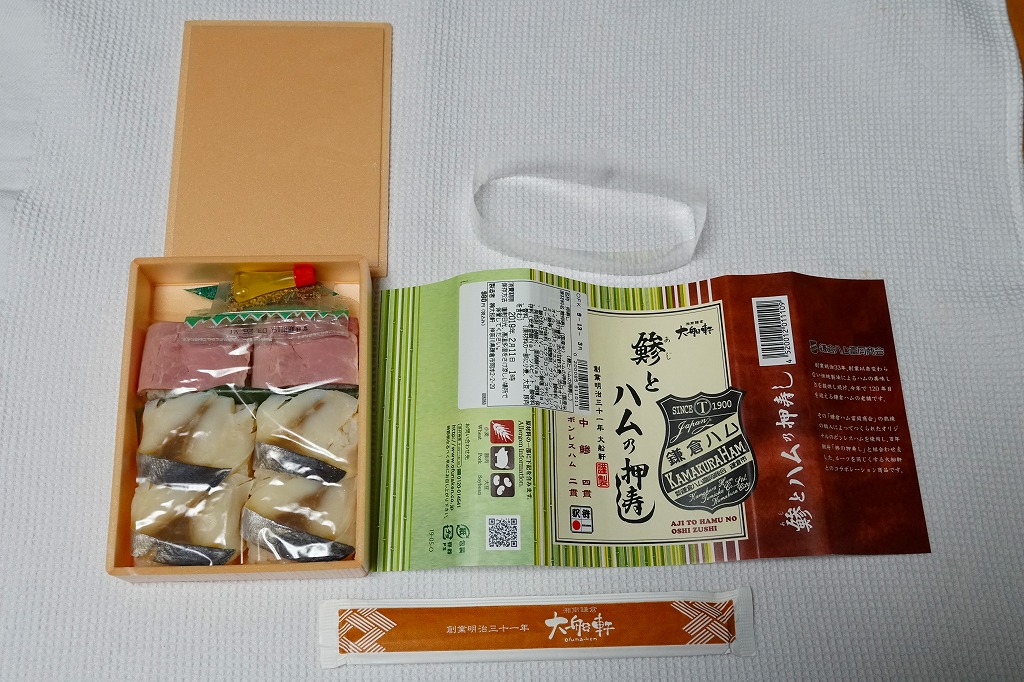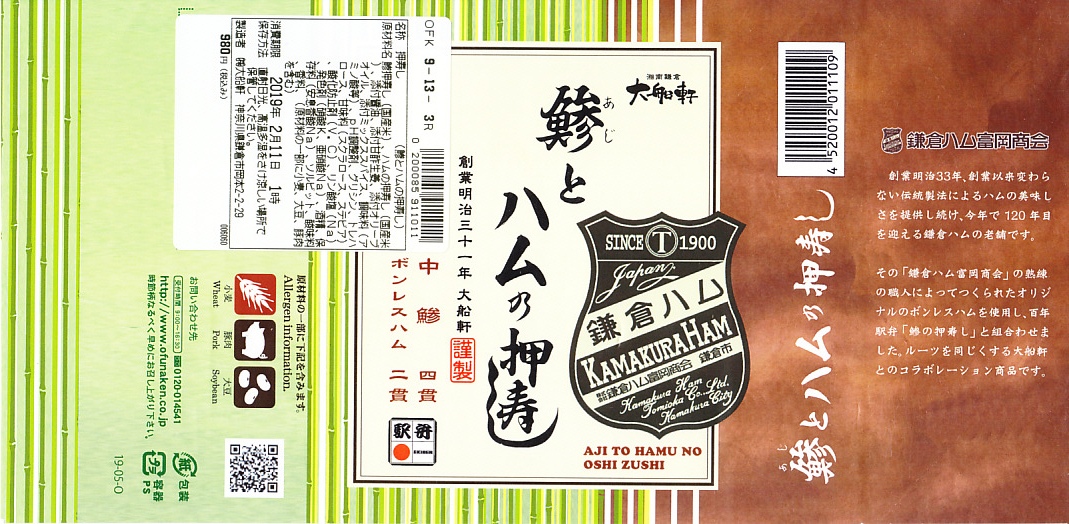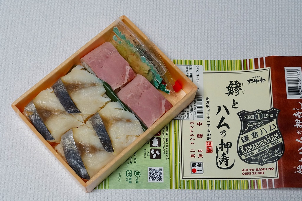 2019(平成31)年2月の発売か。上記の駅弁「鯵の押寿し(中鯵)」4個と、「ハムの押寿し」2個の詰合せ。これもまた大船駅で伝統の駅弁「サンドウィッチ」と「鯵の押寿し」が、百年以上の時を経て合体させたような、興味深い作品。掛紙の絵柄も両者が合体している。1年間ほどの販売か。
