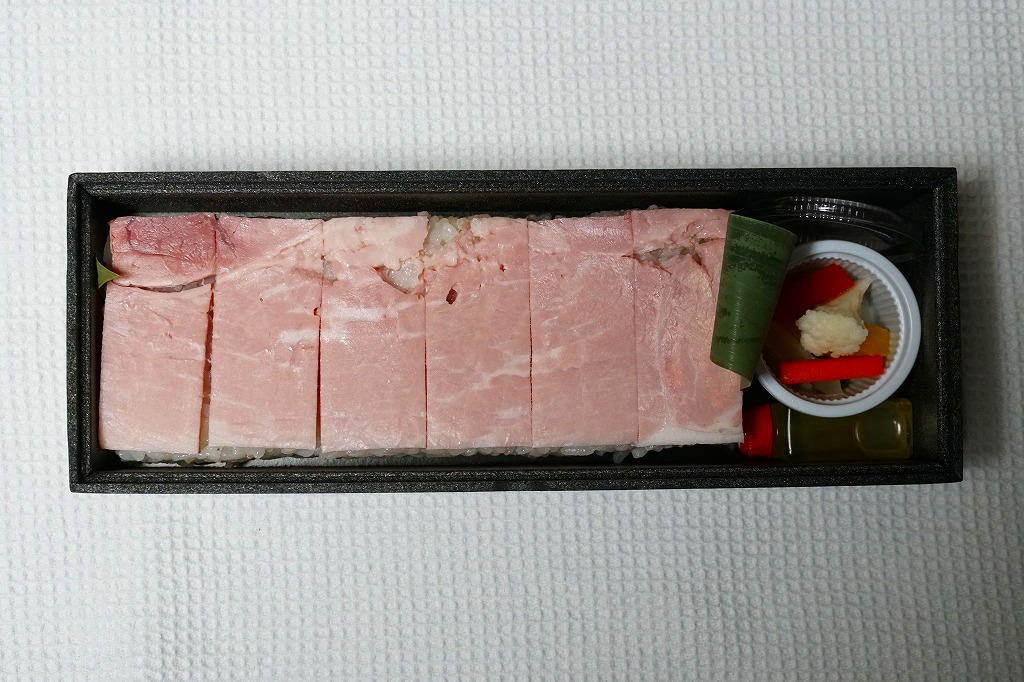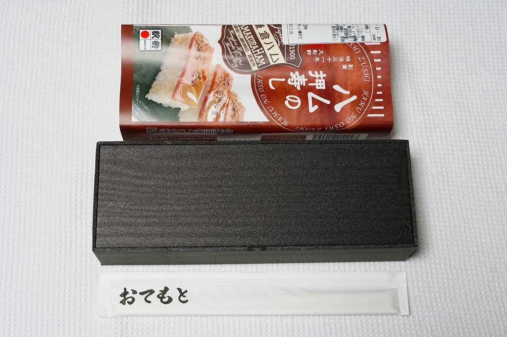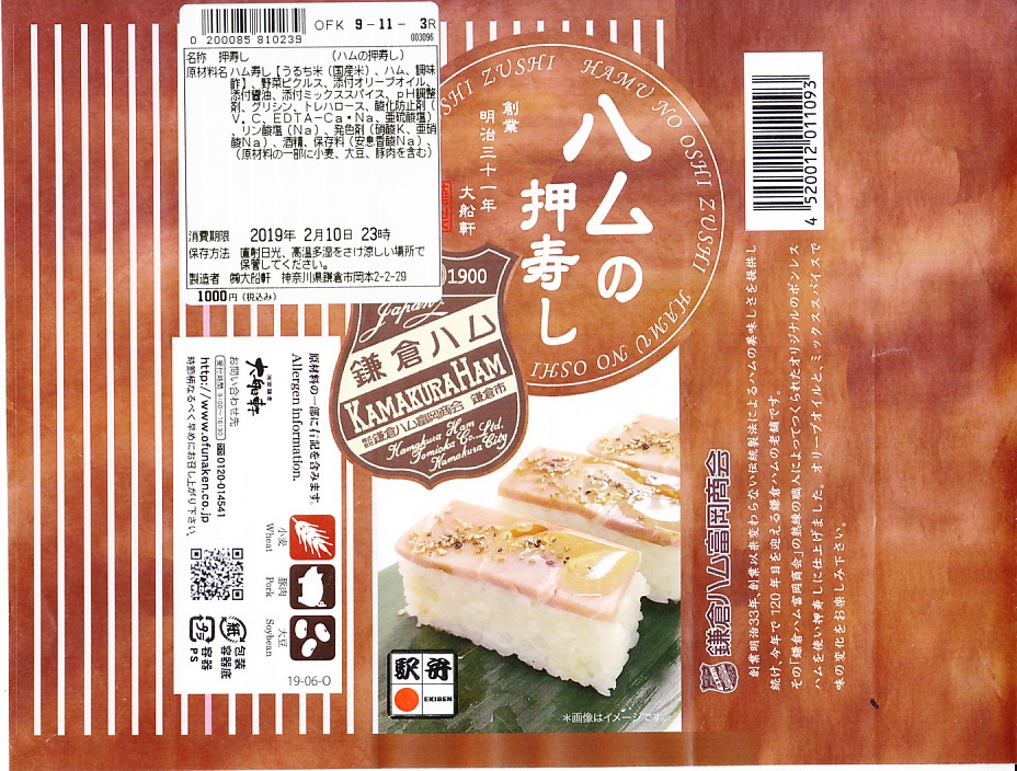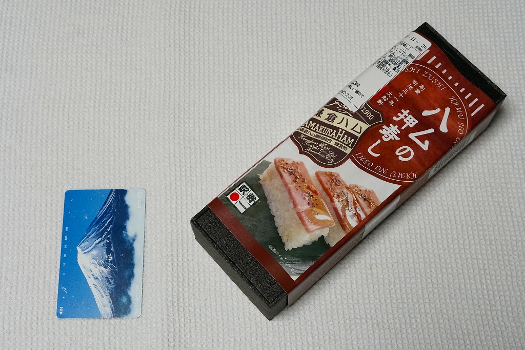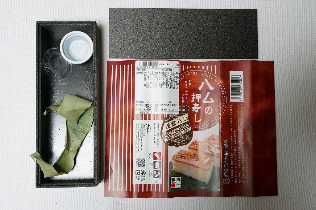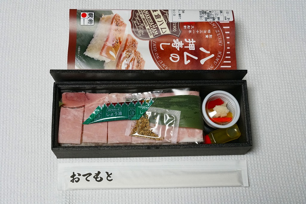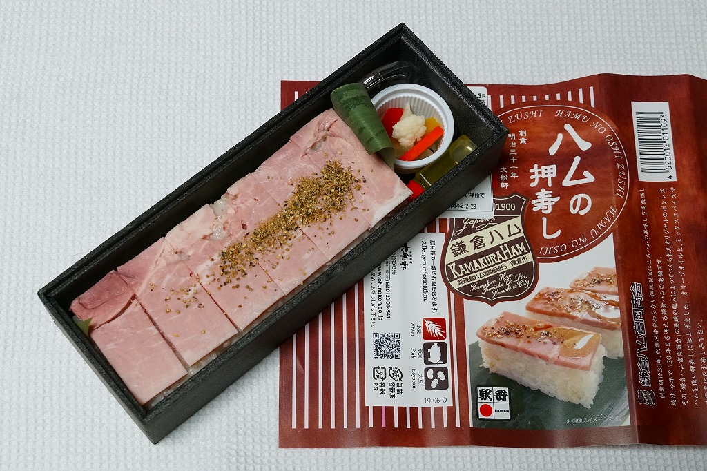 2019(平成31)年2月の発売か。大船駅弁のマスやサバなどと同じ、棒寿司カットの押寿しの身を鎌倉ハムにして、野菜ピクルスのカップを添えたもの。前年の秋にフランスのパリで販売された「幕の内9の彩り弁当」の中身のひとつである「ハムの押寿し オリーブオイル ミックスペッパー」が、単独の駅弁になったと考えられる。大船駅で伝統の駅弁「サンドウィッチ」と「鯵の押寿し」を、百年以上の時を経て融合させたような、興味深い作品。1年間ほどの販売か。
