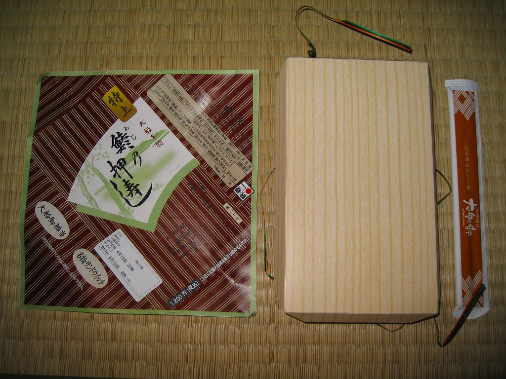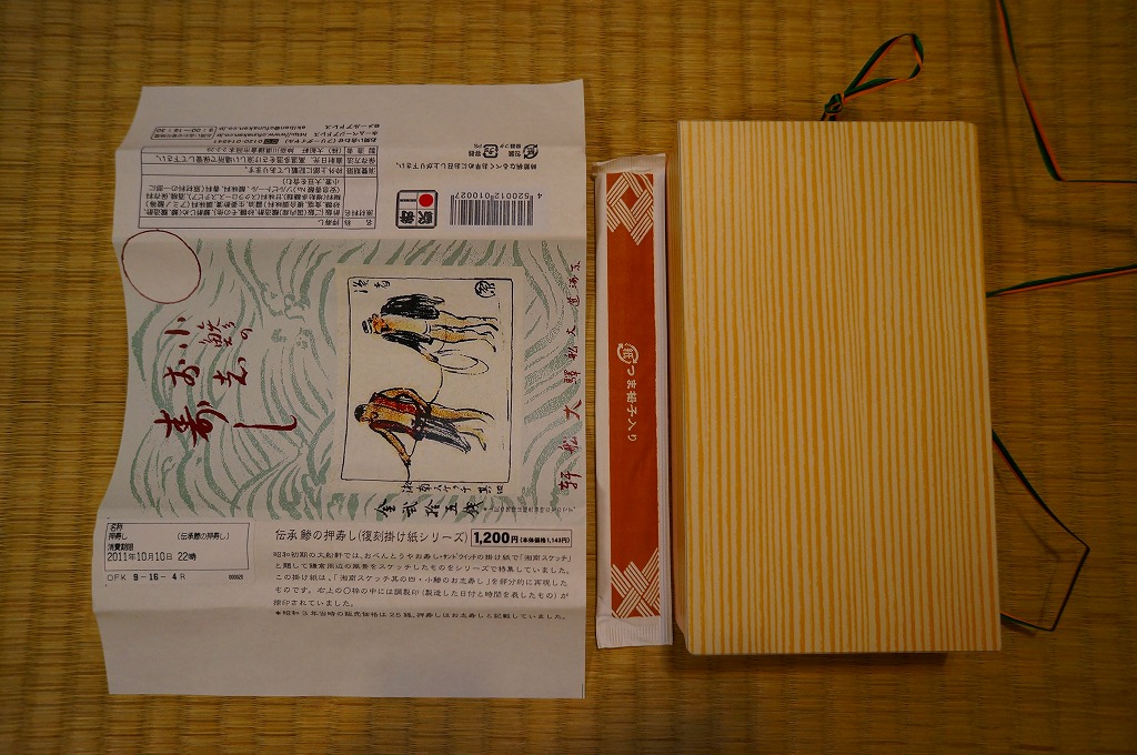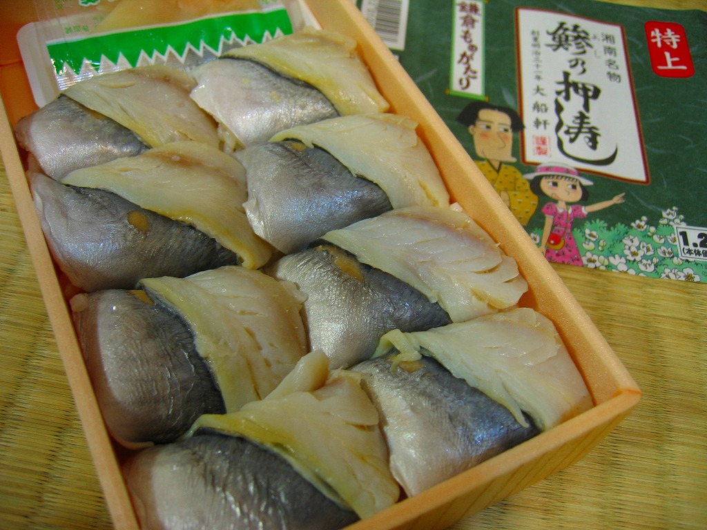 大船駅で百年の歴史を刻む伝統の駅弁「伝承鯵の押寿し」の、2001年時点での姿。中身は変わらないし、いつまでも変わらないと思うが、当時はスリーブでなく掛紙を使い、容器は少し大きかった。この昔ながらのバージョンは、過去には材料が入った時のみ作るとした記事があり、掛紙に「限定生産品」と書いた時期があった模様。