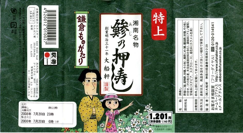 2008(平成20)年7月20日6時の調製である大船駅弁の掛紙。2008年6月から8月まで、マンガ「鎌倉ものがたり」25周年と大船軒創業110周年を記念して、普段の掛紙にその登場人物を2名追加で描いた。価格や中身はいつもの「特上鯵の押寿し」と同じ。