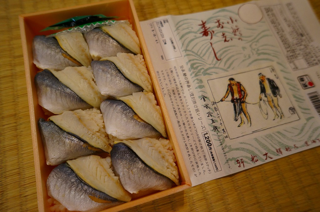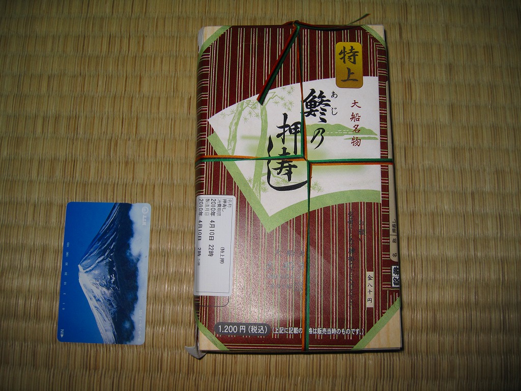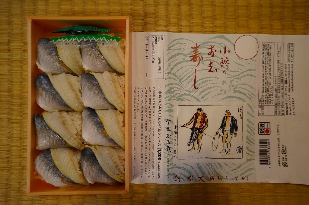 中身はマアジのSサイズ「小あじ」を、半身で酢飯に巻き付けて握り、8個まとめて押した、「関東風に握り、関西風に押す。」と紹介するアジの押し寿司。かつて相模湾でふんだんに獲れたといい、明治・大正時代には沿岸の鎌倉・大船や国府津・小田原の駅弁になった。今では酸味が強すぎる昭和までの味に思えるが、これも伝統ということで。