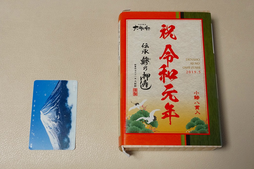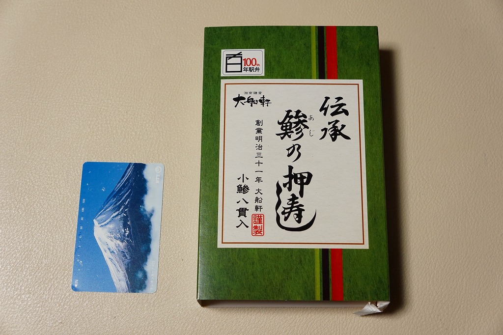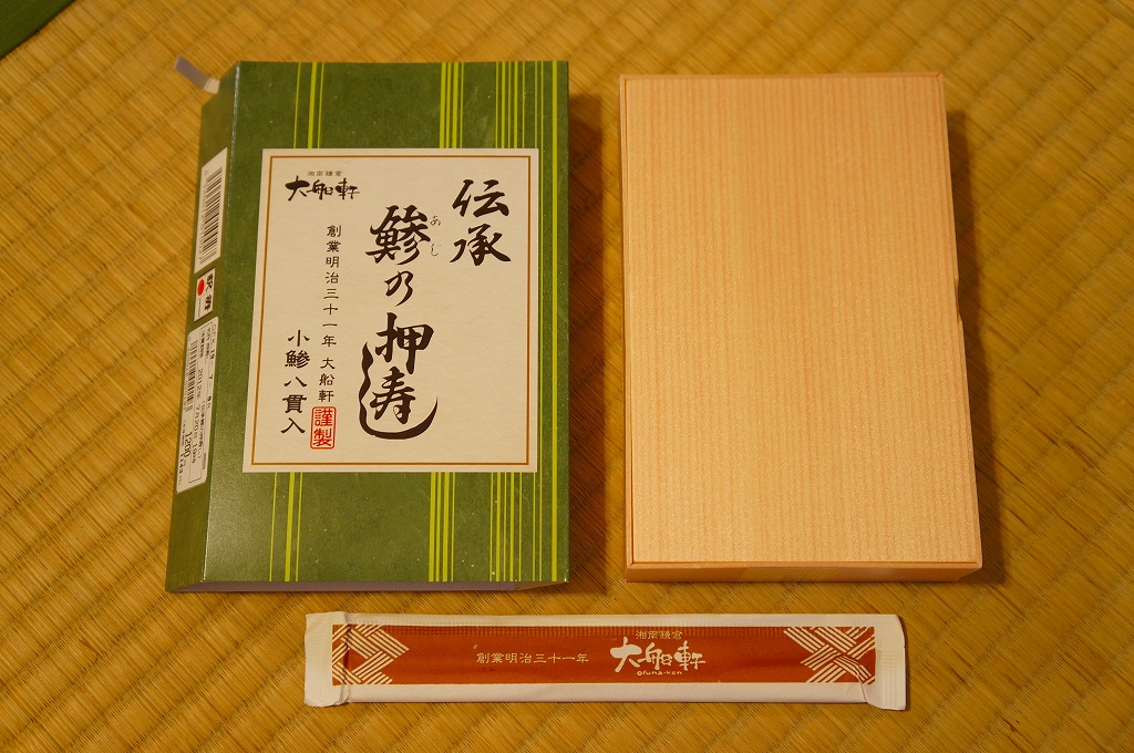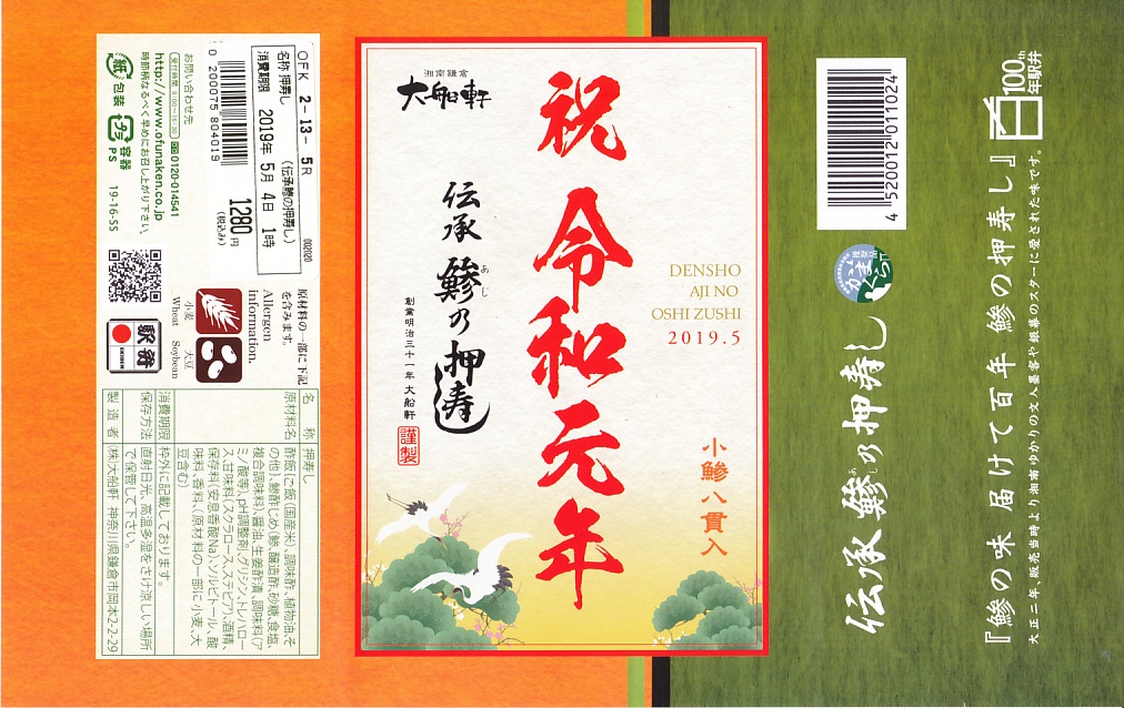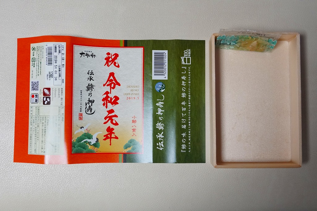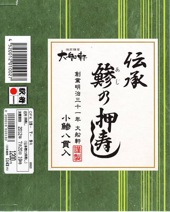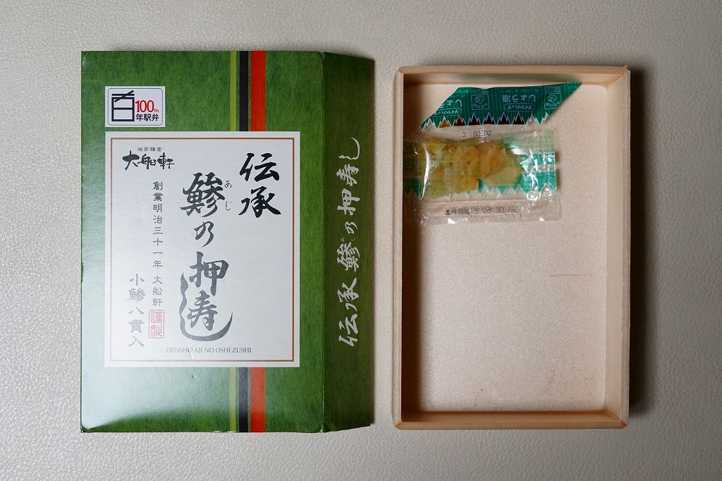 2019(令和元)年8月3日に購入した、大船駅弁のスリーブ。九州で水揚げされたマアジのSサイズ「小あじ」を半身で酢飯に巻き付けた、押し寿司というか握り寿司を一口サイズで8個整列し、甘酢生姜と醤油の小袋を詰めた。2012(平成24)年7月に従前の「特上鯵の押寿し」を、「伝承鯵の押寿し」へ改称のうえリニューアル。同時に、小鯵の高騰や入手難により中鯵のスライスでつくった「鯵の押寿し」は、「鯵の押寿し中鯵」となった。いずれも包装を掛紙からボール紙枠に切り替え。