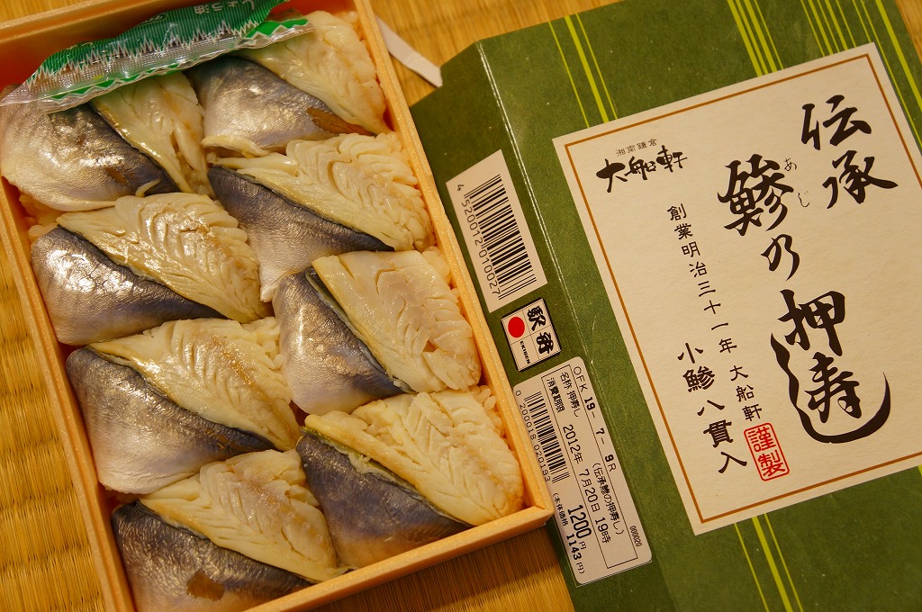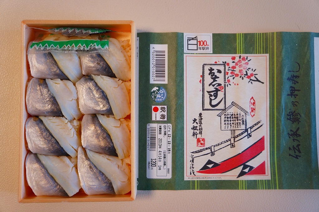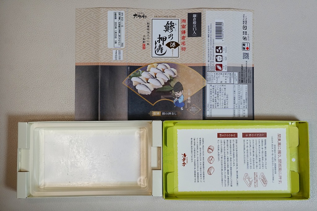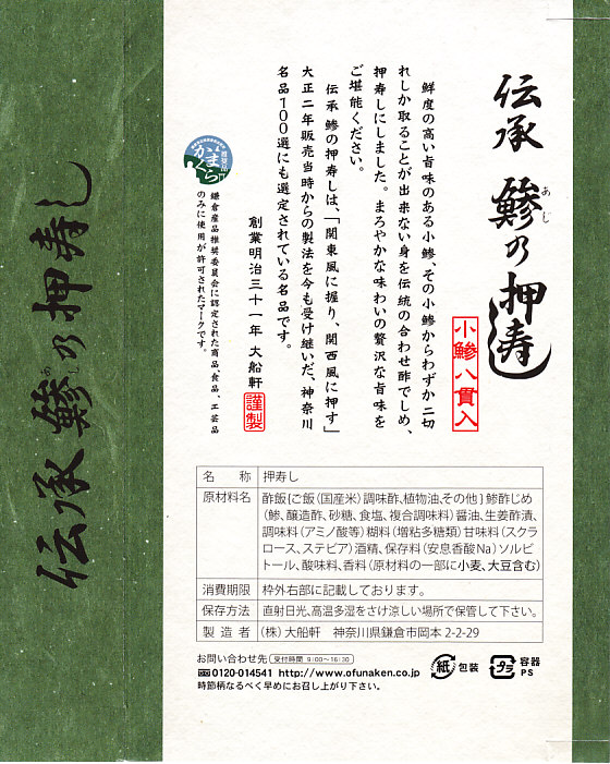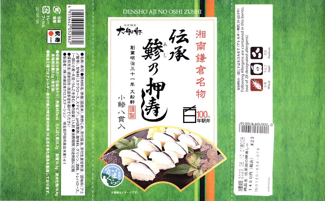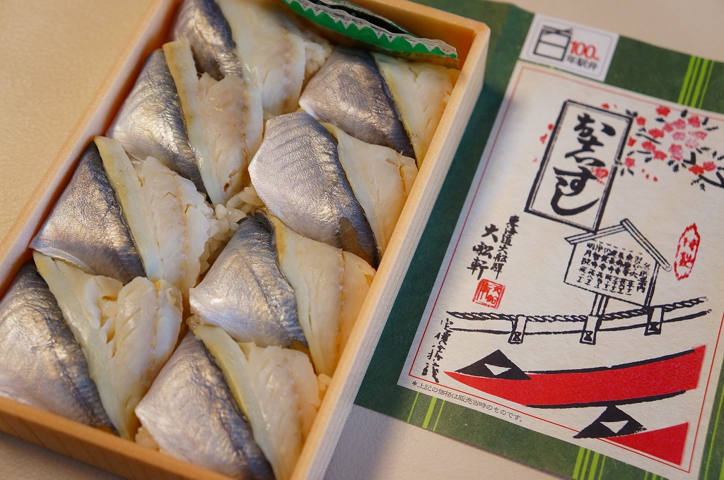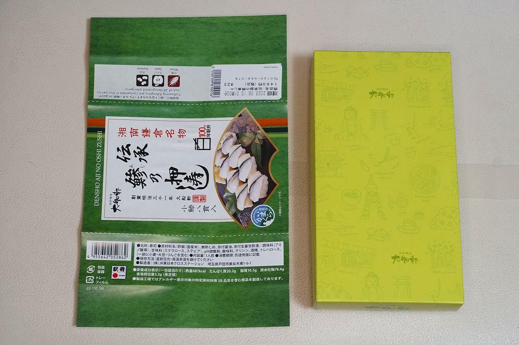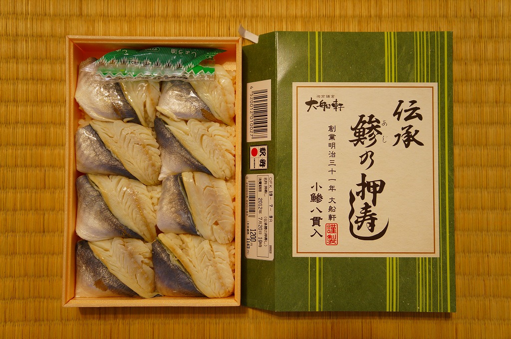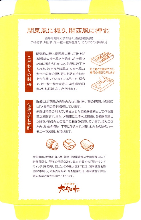 1913(大正2)年4月に大船駅で発売。汽車の時代から東海道線や横須賀線の旅客に、鎌倉の文人や大船の映画人などに愛された、伝統の駅弁。2023年の4月末までに使い始めた紙容器に、抹茶色あるいは竹色に見本写真と商品名を美しく描いた掛紙を巻く。掛紙の裏面で鯵の押寿しの歴史を、中ぶたでその特徴を、多くの文字で紹介する。