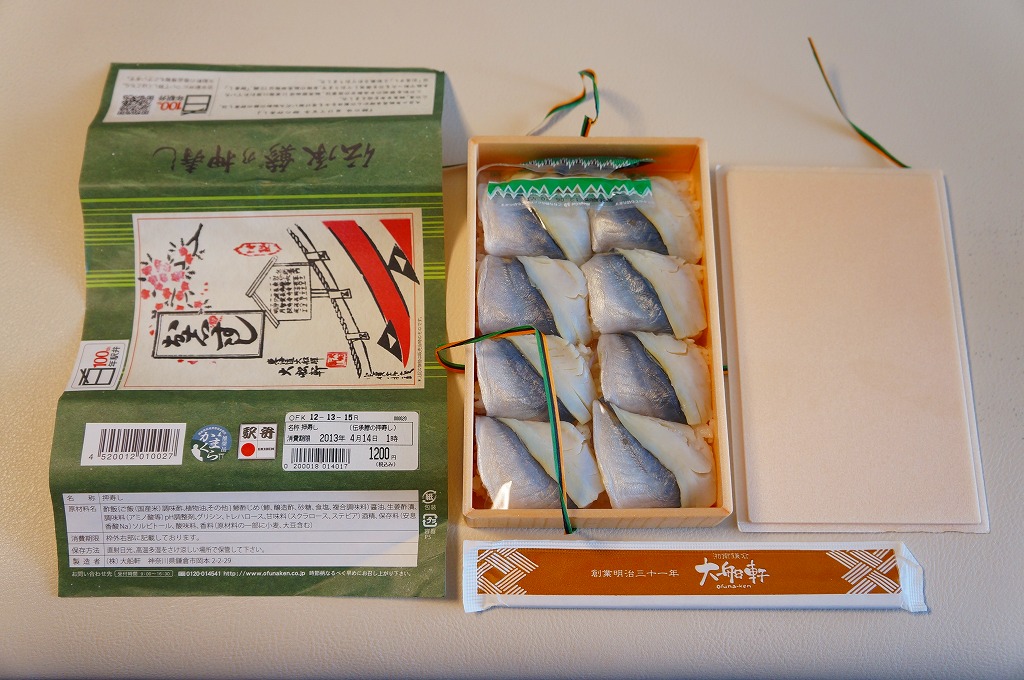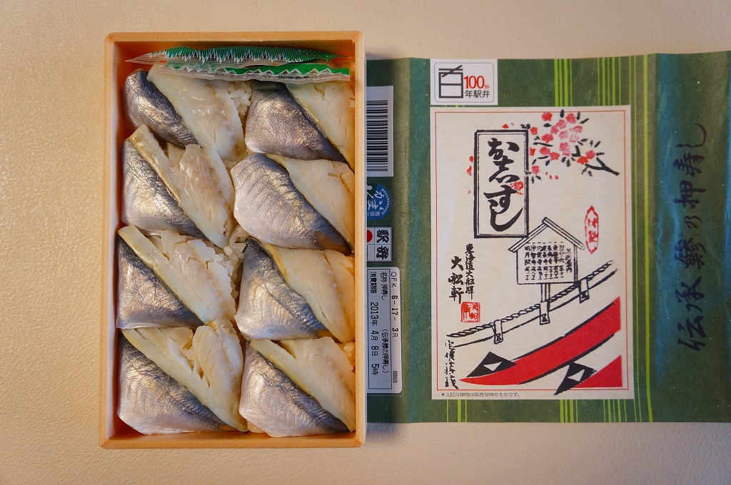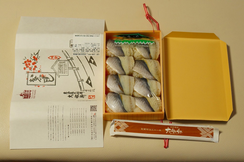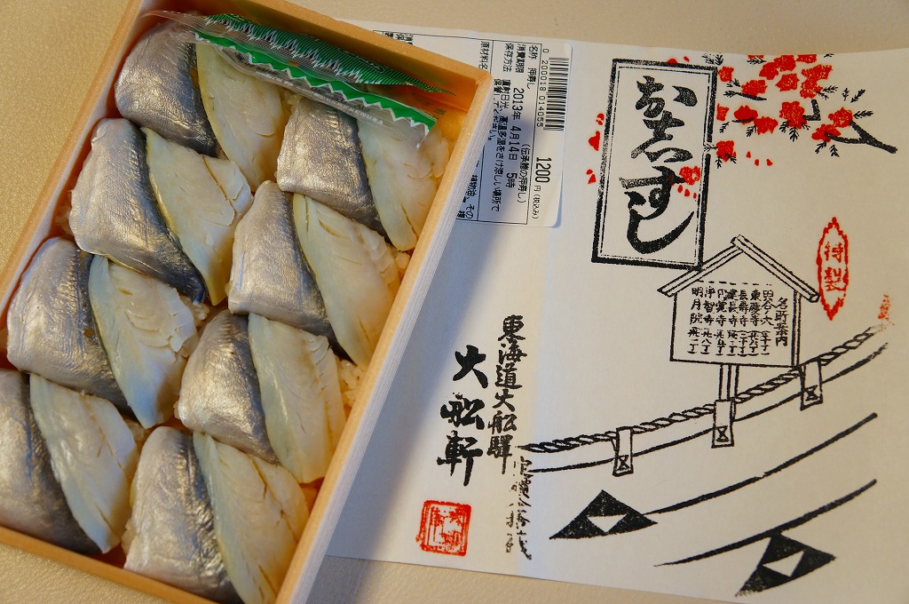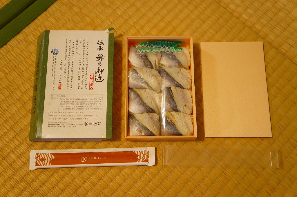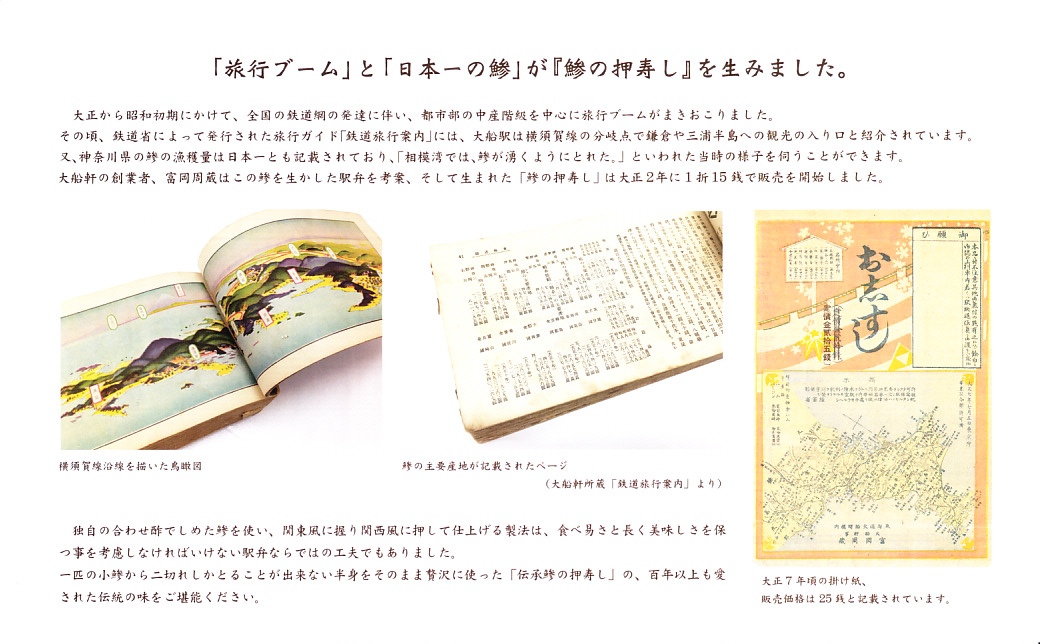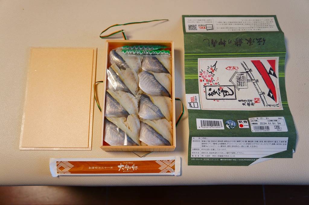 1913(大正2)年4月に大船駅で発売。汽車の時代から東海道線や横須賀線の旅客に、鎌倉の文人や大船の映画人などに愛された、伝統の駅弁。2023年の4月末までに使い始めた紙容器に、抹茶色あるいは竹色に見本写真と商品名を美しく描いた掛紙を巻く。掛紙の裏面で鯵の押寿しの歴史を、中ぶたでその特徴を、多くの文字で紹介する。